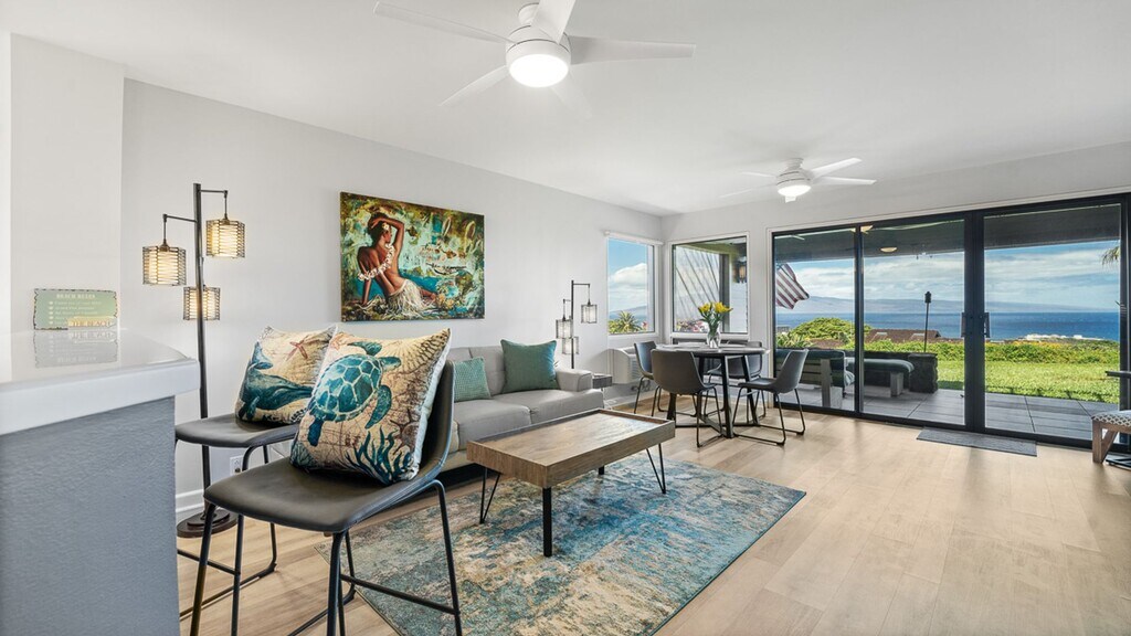 This remodeled and fully furnished 2 bedroom/1.5 bathroom ground floor executive suite at The Masters Kaanapali is breathtaking with exceptional ocean views! Updated appliances, W/D, D/W, granite countertops and renovated 1.5 bathrooms with a walk-in shower. Spiral staircase leads to the upstairs loft second bedroom. End unit offers privacy and no one above you. Located in a pristine gated community with pool, jacuzzi, tennis and pickleball courts, BBQ's and security. $4,500.00 + tax, tenant pays electric, cable and internet. No pets. Available January 5th, Offering a 6-month lease with the possibility of a month to month thereafter. Call Kate Grumet R(S) or Lauren Cyr R(S) with Quam Properties Hawaii to arrange a showing, .