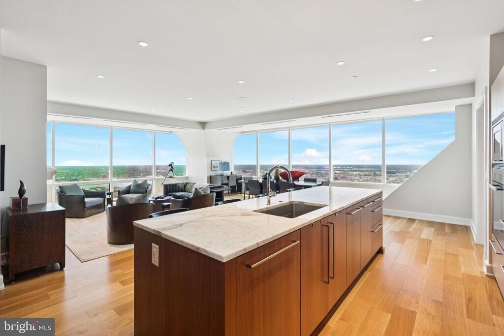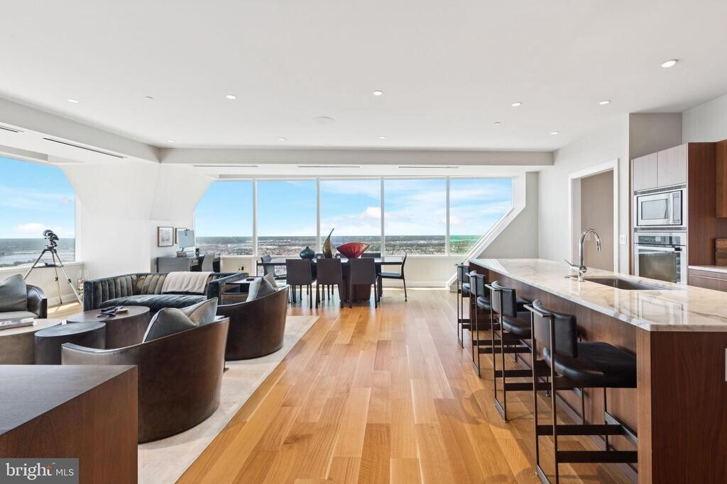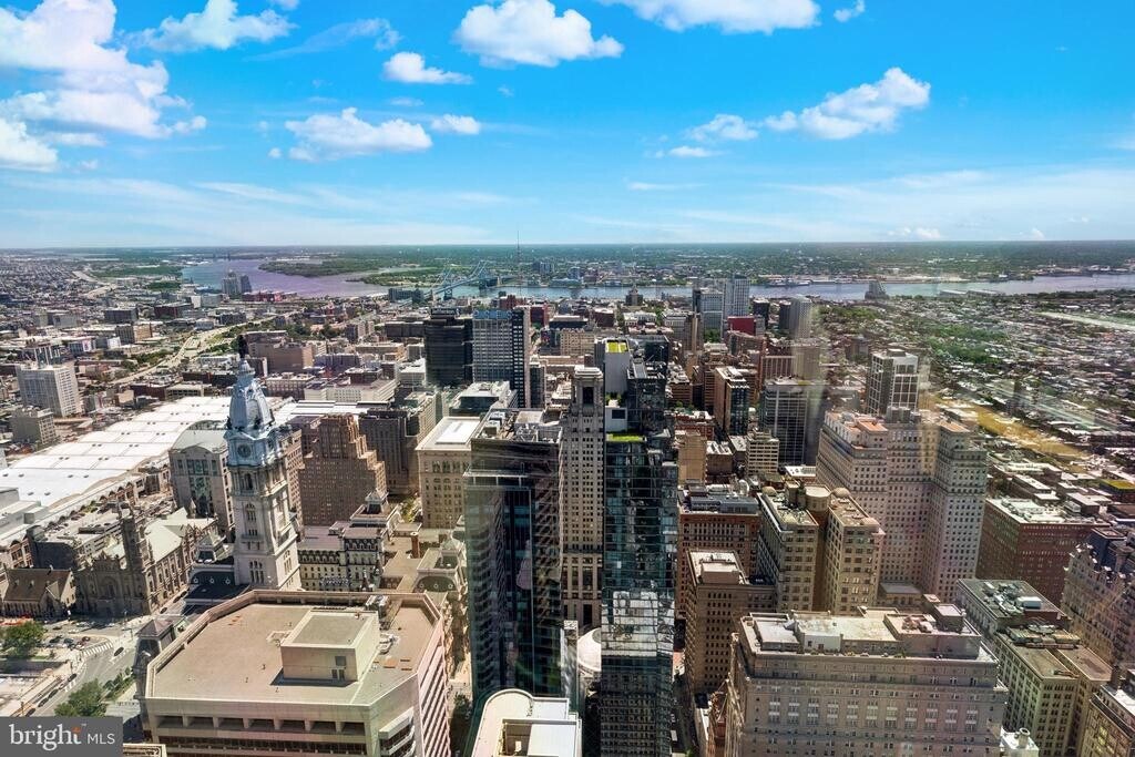 PENTHOUSE PERFECTION IN THE SKY — Welcome to an extraordinary three bedroom, three and a half bath penthouse residence soaring 55 stories above the city. Offering over 2,300 square feet of refined living space, this stunning home captures sweeping sunrise, river, and skyline views through walls of architectural windows that bathe the interiors in natural light. The expansive living and dining areas are framed by soaring ceilings and gleaming hardwood floors, creating a remarkable backdrop for everyday living and entertaining. The chef’s kitchen is appointed with marble countertops, sleek SNAIDERO cabinetry, and premium SUB-ZERO and MIELE appliances, a perfect blend of form and function.The primary bedroom suite is a serene retreat, showcasing picture-perfect vistas and a large, custom walk-in closet. The spa-inspired primary bathroom features double floating vanities, an oversized soaking tub, and a spacious glass-enclosed shower. The second and third bedrooms are generously sized, each with ample closet space and en-suite baths, offering comfort and privacy for family or guests. A pristine, meticulously maintained residence with designer finishes throughout, this is penthouse living redefined at the iconic Two Liberty Place.