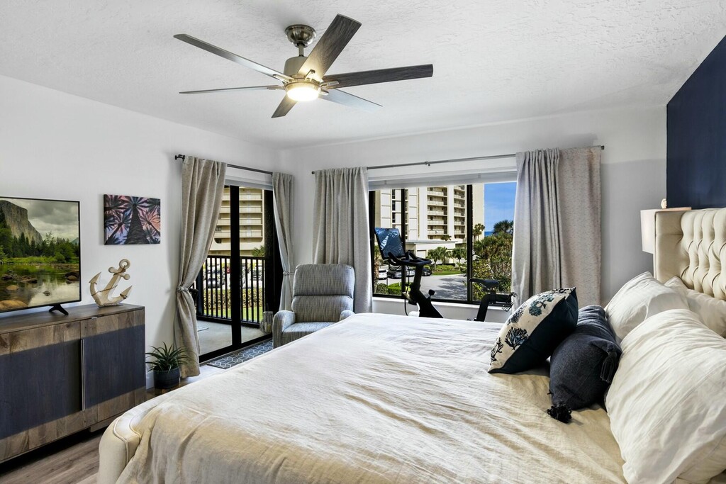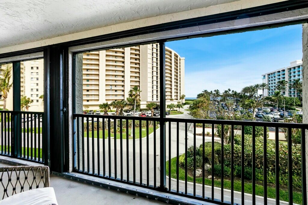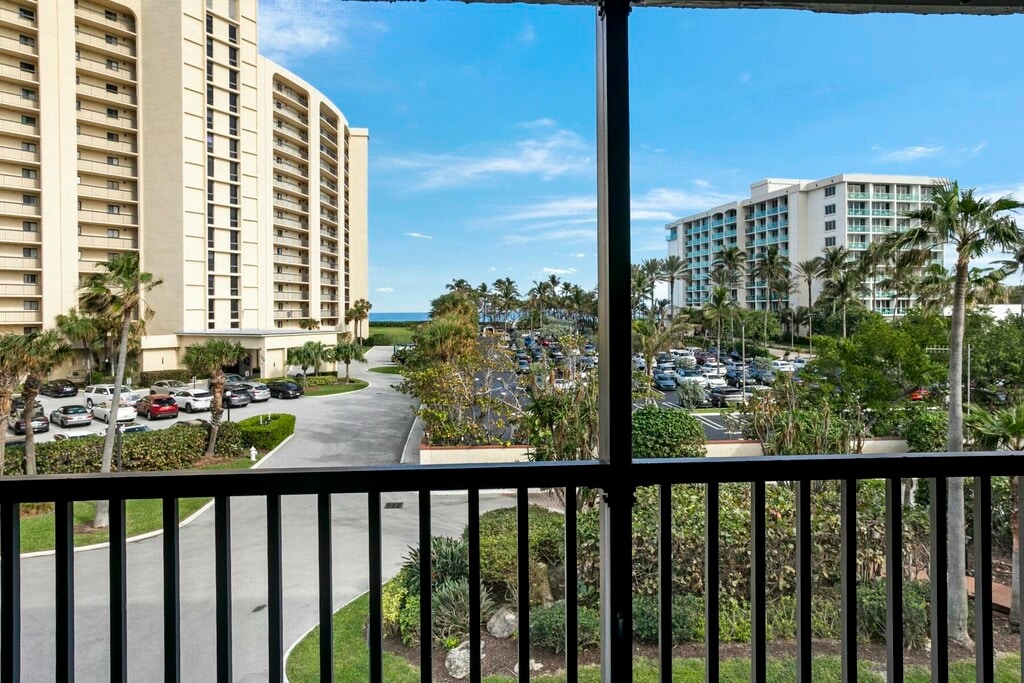 VIEW OF OCEAN, 300 steps from private beach. This oceanside oasis is walking distance to Jupiter Beach Resort (i.e. walk to spa and tiki bar), 1 mile from Jupiter's most favored dining spots..... UTiki, Guanabanas, Charlie & Joe's Love Street,Publix, Movie Theater and Harbourside. Enjoy your morning coffee with amenities that include 1 King Bed, 1 full size murphy bed, 2 full baths, eat in kitchen, loads of storage, massive walk-in closet. Perfect WFH location. DIRECT ocean view balcony with dining, beach chairs, bikes, umbrellas, beach toys etc., private parking spot, pool, hot tub, and tennis courts. Minimum 1 month rental.