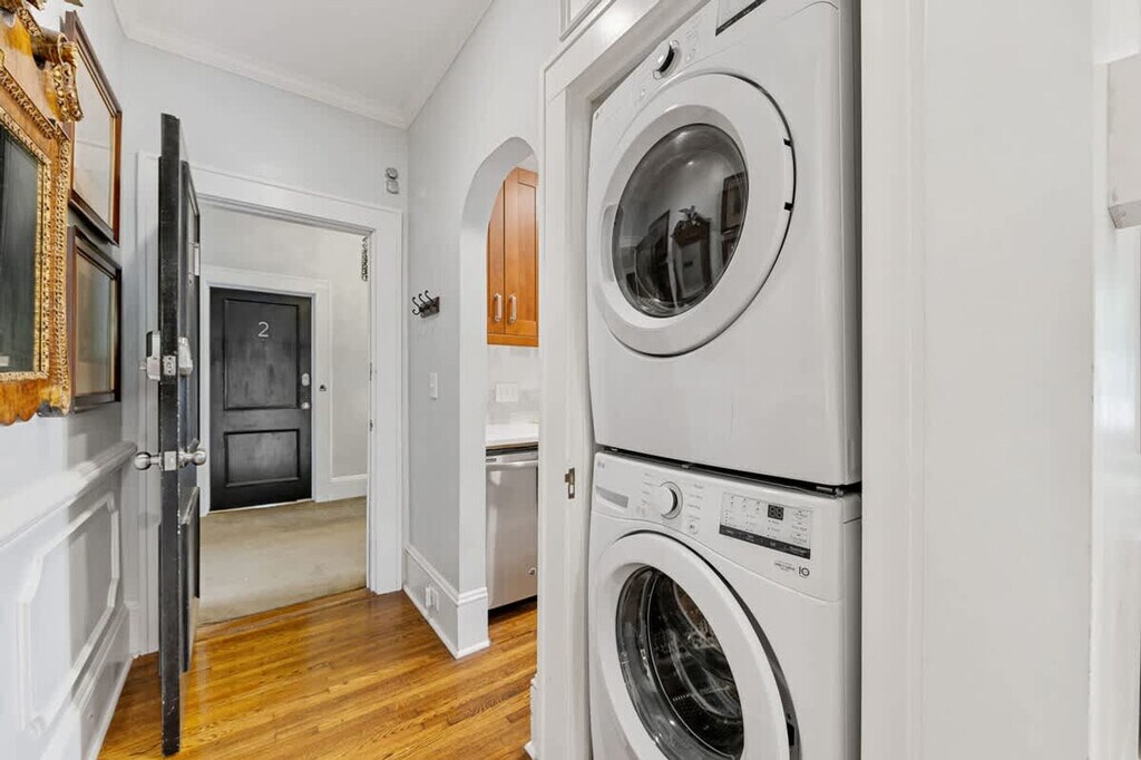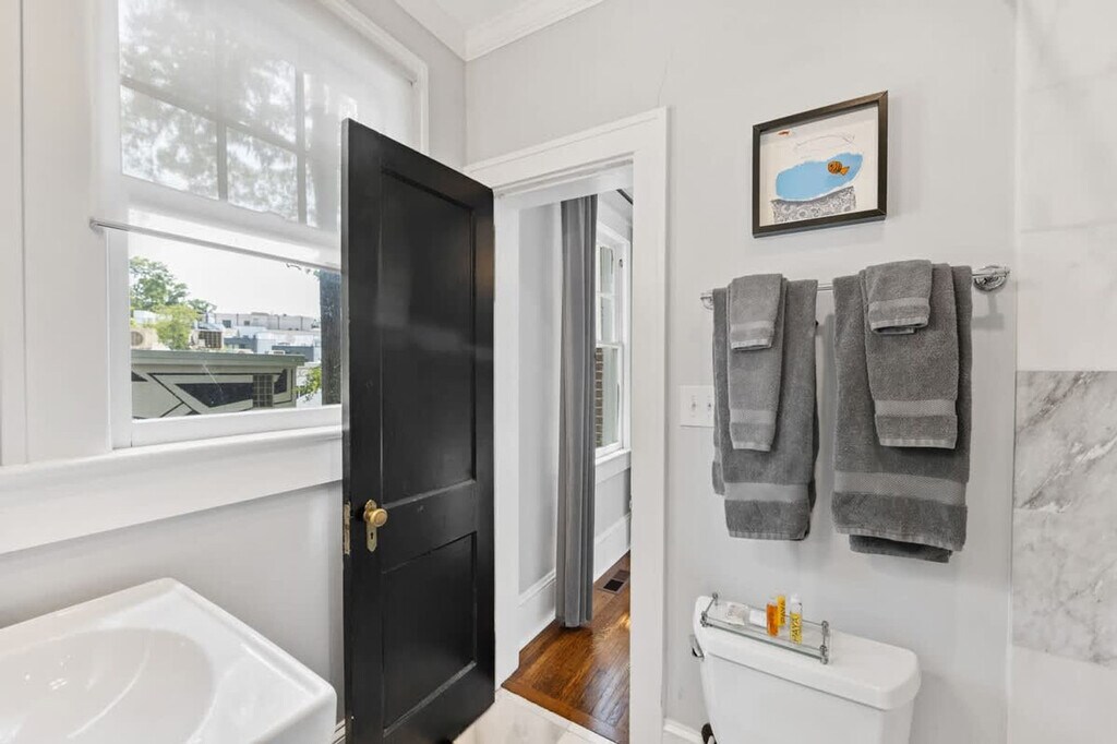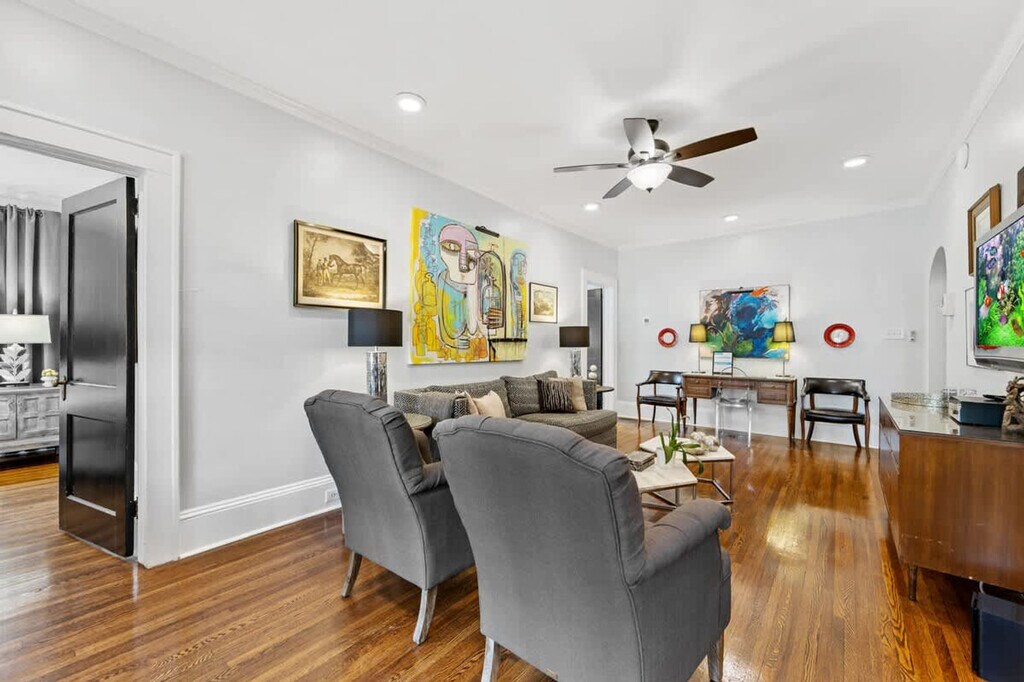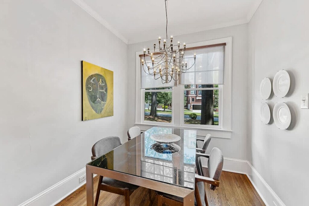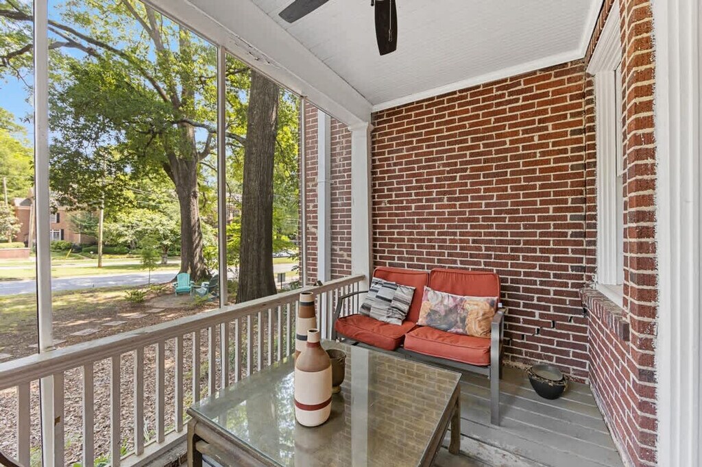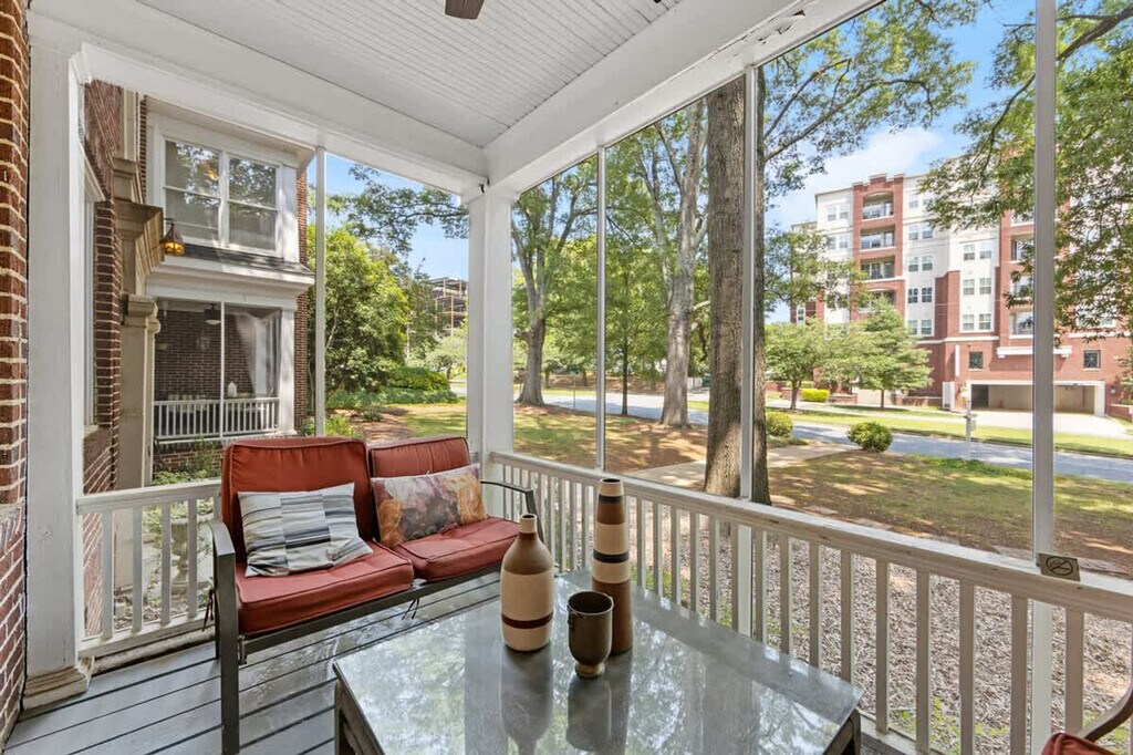 Escape to this super-luxe 2-bedroom condo on the ground floor of a historic 1920s apartment building in historic Myers Park. Feel at home in this residence that sleeps up to 6 and is located on Queens Rd, one of the prettiest tree-lined avenues in the entire city. This residence provides the ultimate in furnishings, art, and high-end finishes. The galley kitchen is fully equipped with pots, pans, utensils, a gas range with convection oven, refrigerator with ice maker, dishwasher, disposal, and a stackable washer and dryer. Off of the kitchen, a dining area seats six. The large living room features upholstered furniture for comfortable seating and a flatscreen television for entertainment. Enjoy 400-thread-count linens and thick Egyptian cotton towels. Each bedroom has a generous closet and a television. Stainless appliances with granite countertops, new heating and cooling systems, and plumbing provide modern amenities, while the original refinished hardwoods, bathroom tile, graceful arched doorways, and 2-panel doors provide the charm so often absent in new construction. Large double-hung windows let in an abundance of light in all of the rooms, and the screened porch provides comfortable outdoor living space. Charlotte’s biggest and best fitness center, the Dowd Y, is only five minutes away. Amenities include cardio equipment, weights, group classes, and swimming. A 7-day pass is $50. If you are traveling with a dog, it must be registered at a cost of $59 per dog (two maximum). If you do not register your dog, you will be charged $120 per dog. Welcome to Myers Park, a prestigious and sought-after neighborhood near Charlotte that offers an exquisite backdrop for your stay. Immerse yourself in the elegance and sophistication that defines this historic district. Myers Park is renowned for its stunning tree-lined streets, meticulously landscaped gardens, and exquisite architecture. Indulge in the vibrant culinary scene of Myers Park, where upscale restaurants, charming cafes, and trendy eateries beckon. For nature enthusiasts, Myers Park boasts enchanting green spaces and parks that provide a tranquil retreat from the bustling city. Take a leisurely stroll through the lush gardens of Wing Haven or immerse yourself in the natural beauty of Freedom Park. Myers Park's prime location grants easy access to Charlotte's most iconic attractions and cultural destinations. The streetcar to Uptown is a 10-minute walk away. Uber/Lyft are also convenient options, and many bikeshare companies offer inexpensive bikes. Wide sidewalks and towering oaks throughout the neighborhood provide an ideal place for walking or jogging, and a coffee shop, multiple restaurants (including Ethiopian, Thai, casual and fine Italian, etc.), shopping and even an independent movie theater are a half mile away. Spring through fall, a farmers market is open Wed, Fri and Sat around the corner from the apartment, and a new greenway offers a convenient connection to Freedom Park, Dilworth and Carolinas Medical Center. Quiet hours are between 10 pm and 7 am. Dogs are never allowed on the furniture or bed. If there is hair on the furniture, excess hair in the home, stains, damage, or waste found in the yard or home, you will be charged an additional fee. Only two dogs are allowed per stay unless otherwise approved. No parties, events, or large gatherings are permitted. Smoking and vaping are not allowed inside or outside the home or building. Guests must be at least 21 years old to make a reservation, and this rule is strictly enforced. Air conditioning must remain between 72 and 75 degrees in the summer and 68-72 in the winter and on AUTO to help ensure it stays in good working condition during your stay. Keep doors and windows closed as much as possible. [SI]