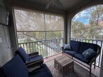 Available for an annual lease only. This furnished condo is tastefully decorated and comfortable. The private bedroom and full bath are upstairs. The main living area not only has the family room but a den that is furnished with a pull-out sofa and TV. No carpet, hard wood laminate floors are throughout. Extra seating is outside on the screened lanai. Full size washer and dryer are inside the unit and storage closet is out on the lanai. The community has swimming pools, fitness center, tennis/pickle ball courts and clubhouse.