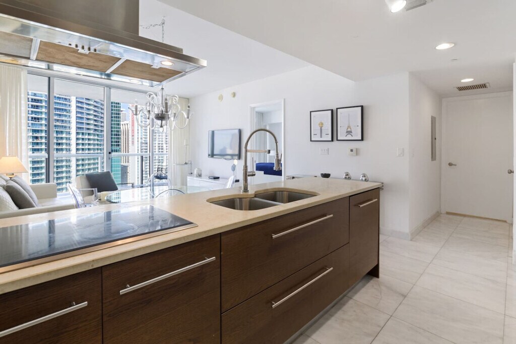 The advertised rate of $6,311/month is the lowest available price, based on a 30 day(s) stay with a move-in date of August 7, 2026. Rates vary depending on the duration of stay, season, and other parameters. For exact pricing and additional pricing components, please visit our website and enter your desired move-in and move-out dates. The rate is applicable when billed upfront; it can be higher if billed in multiple payments. Feel at home in this 876 sq ft apartment in downtown Miami, Brickell, facing the iconic Brickell Key, with breathtaking ocean and city views. Located on the 27th floor, this spacious apartment is completely refurbished. This apartment is equipped with full kitchen utilities including dishes, glasses, pots and pans, cutlery, a dishwasher and dish soap. Also available are pure roast coffee, a coffee machine, tea, a toaster, a blender, a hair dryer, an iron with ironing board, and a vacuum. Pool and beach towels, towels, shampoo, body wash, conditioner, hand soap, and tissues are also provided. An air mattress, baby crib, and cot can be provided upon request prior to arrival. Access to the largest residential pool in Florida is available in the building for free, as well as a free business center, spa, jacuzzis, and gym, where yoga classes are also provided. W Residences is centrally located in the Miami business district overlooking Miami Bay, close to Wynwood, Midtown, South Beach, and the Miami Art Design District. The neighborhood is surrounded by skyscrapers and a mixed landscape, with fine-dining restaurants, nightlife venues, local coffee shops, and organic grocery stores, as well as street family organic markets on weekends. Management asks that guests collaborate in maintaining a clean and healthy environment by using the trash chute located on every floor for everyday household trash, ensuring that trash bags are properly sealed to avoid any leakage on the hallway carpet. When entering and exiting the common areas of the property, all guests are required to adhere to a proper dress code such as shirt, pants, and shoes. Please do not throw or drop off anything from the balconies. No gas or charcoal grills, or any devices with open flames are allowed on the balcony or in the unit at any time. To access the pool and gym, a reservation is required to be made at the ground floor of the building, where guests can retrieve guest amenity passes before heading to the pool or the gym. Management requires a picture of every guest's ID in order to be registered in the system for check-in. Please provide an estimated time of arrival as soon as possible and in advance to avoid any long wait at check-in. [SI]