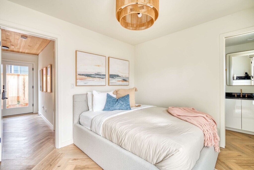 Feel at home in this stylish townhome steps from Portland’s Alberta Arts District, featuring vaulted ceilings, herringbone floors, and tons of natural light. This home features a chef’s kitchen, Juliet balconies, and a cozy patio. The sleek open kitchen is stocked with everything from sharp knives to a French press. Relax in the stylish living area with a Smart TV. The lower level offers two private bedrooms, including a fully separate in-law suite with its own entrance, kitchenette, lounge space, and en-suite bathroom. The second bedroom on this floor is quiet and restful with warm textures and quality linens. Two bright bedrooms on the upper floor open onto Juliet balconies via oversized sliding glass doors. Soft linens, room-darkening curtains, and ample storage make these rooms both functional and serene. A modern shared bathroom and in-unit laundry room round out this top floor. One of Portland’s most vibrant and walkable neighborhoods with a 91 WalkScore, Alberta Arts is bursting with color, culture, and creativity. Murals line the streets, and nearly every block is home to an art gallery, boutique, coffee shop, or food destination. Walk to Salt & Straw for inventive ice cream flavors, grab brunch at Tin Shed Garden Cafe, or enjoy local beers at Great Notion. Alberta Park is just a few blocks away for green space and a relaxing stroll. You're just 15 minutes from downtown and 20 from the airport, close to everything yet tucked into one of Portland's most beloved residential pockets. Alberta’s best restaurants, boutiques, parks, and art galleries are just steps away. Downtown is about 15 minutes by car or transit, and PDX airport is just 20 minutes away. This is a new construction home with excellent soundproofing, but please be respectful of quiet hours after 10 p.m. Smoking tobacco or marijuana inside is strictly prohibited and if detected, will result in $150 penalty. Events and/or parties are strictly prohibited and will result in fines per host discretion and immediate eviction. Quiet hours are in effect from 10pm - 7am. Any unauthorized guest is subject to a $150/guest penalty. Unauthorized use of extra bed/s or bedroom/s a fine of $75. Undeclared pets are subject to a $200 per stay penalty. Any unauthorized early check-in or late check-out is subject to a $75 fee. A lost, missing or otherwise unreturned key is subject to $100 fee. Missing remotes will incur a $50 fee. Violation of house rules may result in eviction and/or monetary fine. Please respect check-in and checkout times. [SI]