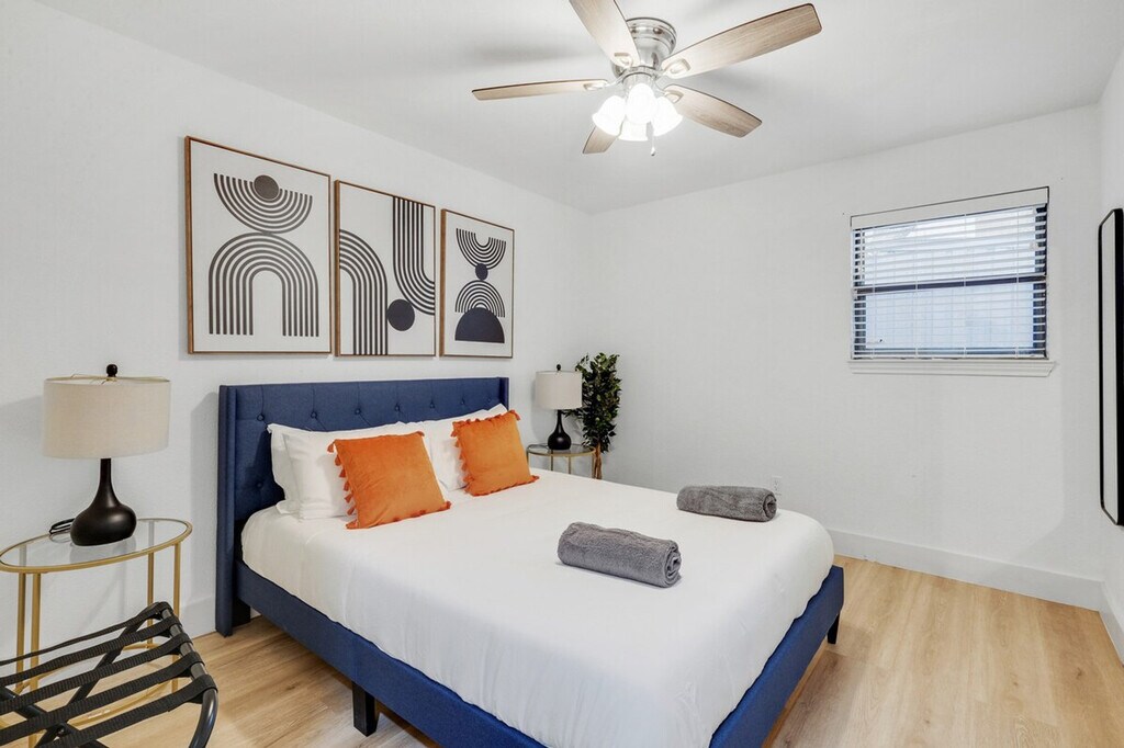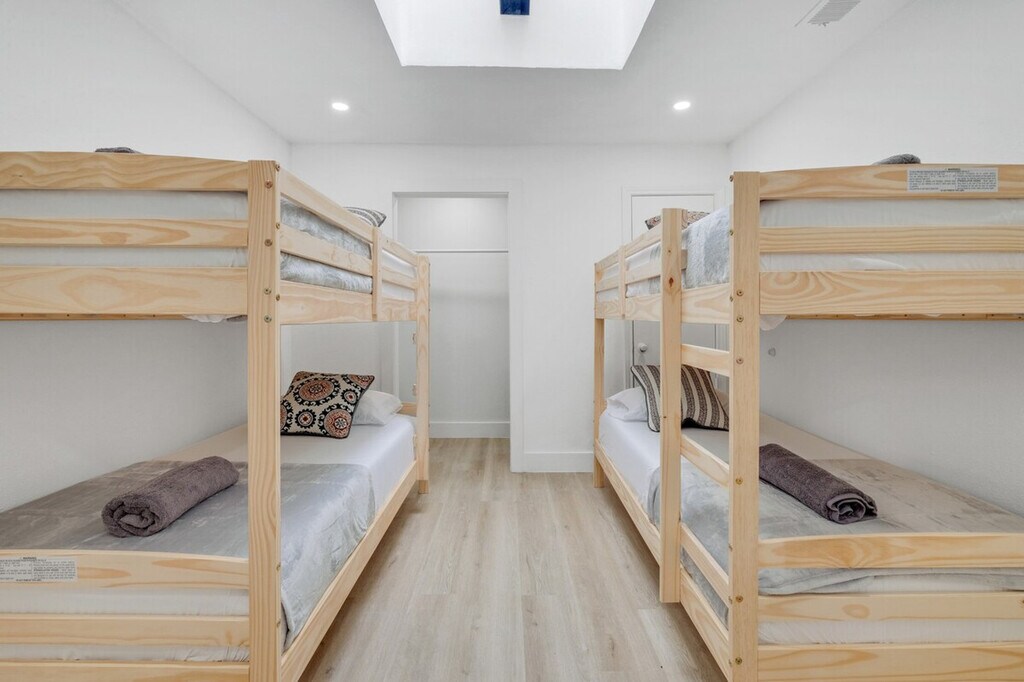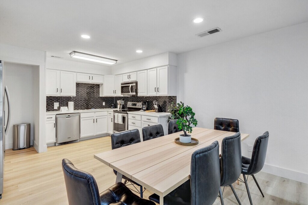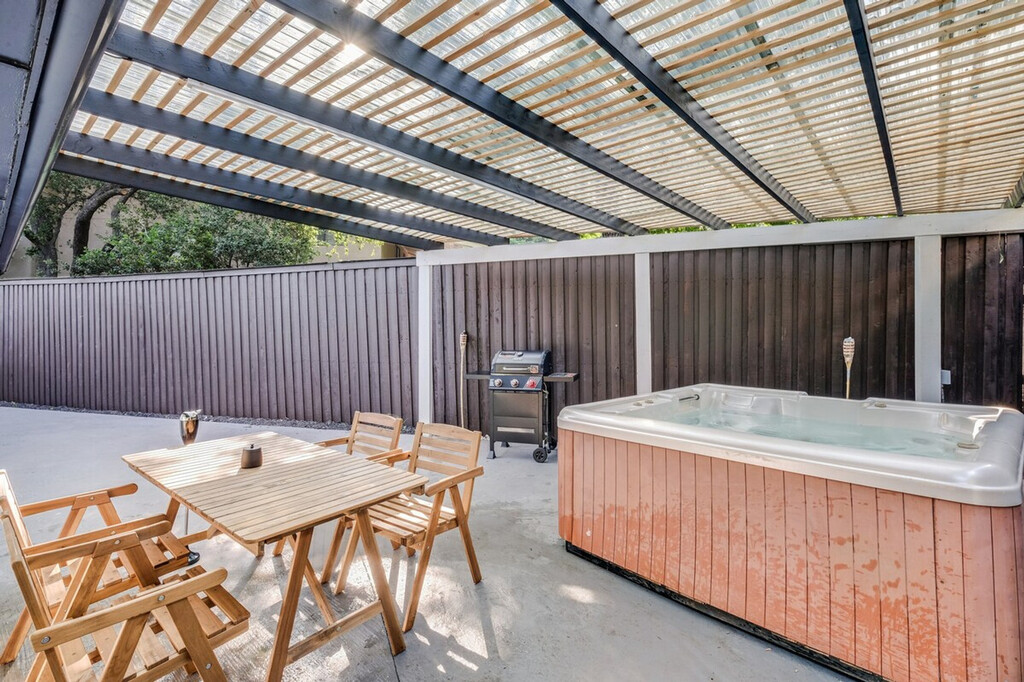 Feel at home in this centrally located Dallas retreat, featuring four bedrooms and two bathrooms. This modern and cozy single-level home is beautifully designed to provide the perfect setting for relaxation and celebration. Unwind in the gorgeous hot tub for the ultimate relaxing experience after a day of activities, making it an ideal place to create lasting memories with family or friends. The sleeping arrangements include a king-size bed in the primary bedroom, queen beds in the second and third bedrooms, and two twin-over-twin bunk beds in the fourth bedroom. The primary bedroom features an en-suite full bathroom, while a second full bathroom serves the other rooms. The fully loaded kitchen is perfect for preparing meals, complete with a large dining table, kitchen bar area, and breakfast nook. Additional amenities include high-speed Wi-Fi, air conditioning, heating, and a washer/dryer. This pet-friendly home welcomes house-trained pets with a fee of $150 per pet per stay. The fourth bedroom will only be opened for groups of six or more guests. The nightly rate includes the first six guests, with an additional fee of $39 per night for each extra guest. Nestled in a quiet suburban neighborhood in Dallas, this home offers a peaceful environment while being close to city amenities. With tree-lined streets and well-maintained homes, it's perfect for guests seeking a calm retreat. Though car-dependent, the area provides easy access to local parks, dining, and shopping, as well as nearby attractions in Dallas. Conveniently located near grocery stores and restaurants, it's just a short drive from the city's vibrant areas. No smoking is allowed inside the property, with a $750 fine for violations. The hot tub is professionally serviced twice a week during the summer and once a week during the rest of the year. Security cameras are installed at the front door and garage for safety purposes, recording 24/7. Check-in is from 4:00 p.m. onwards, and check-out is at 10 a.m. max. Quiet hours are between 10:00 p.m. and 9:00 a.m. Unregistered guests and street parking are not allowed. Any violation of house rules may result in penalties. The home is equipped with high-speed Wi-Fi, making it suitable for remote work-friendly stays. [SI]
