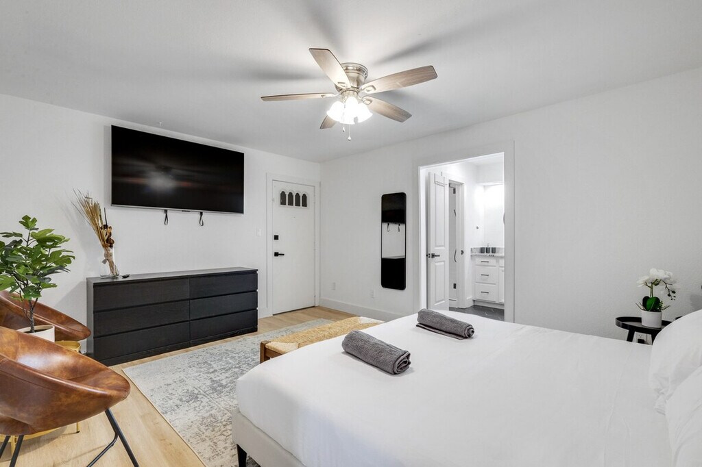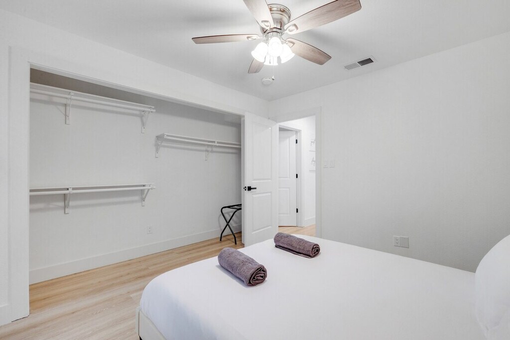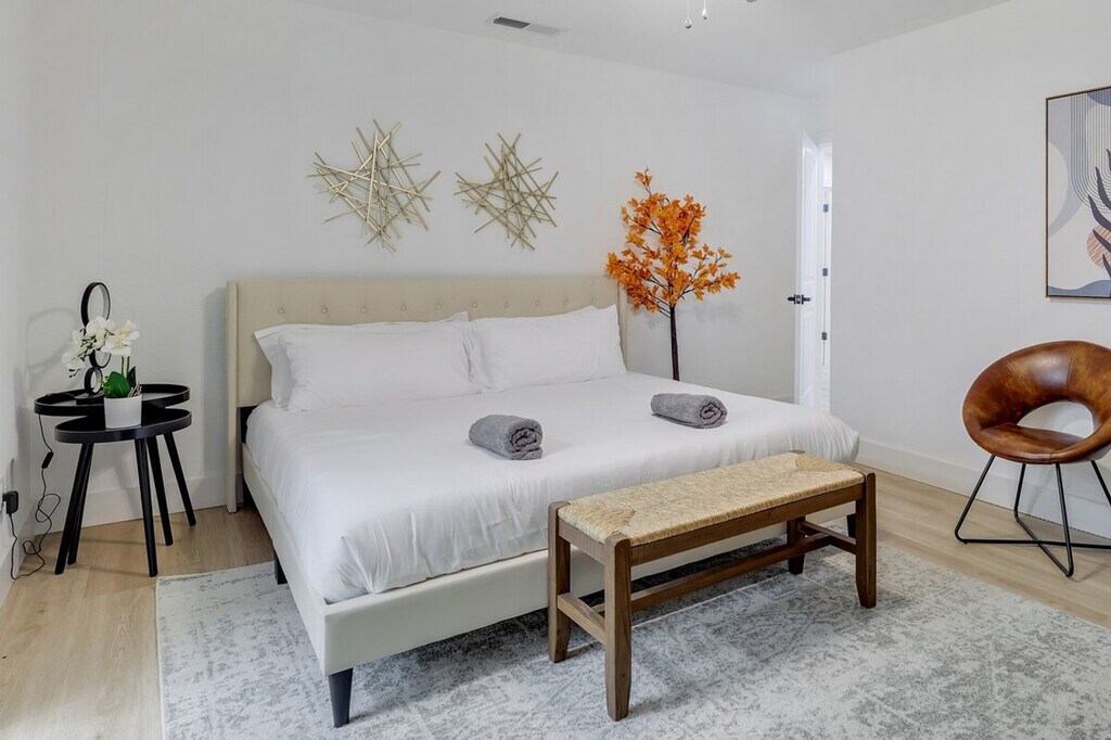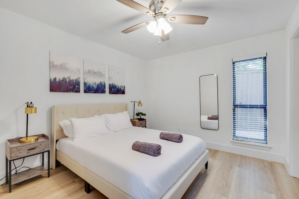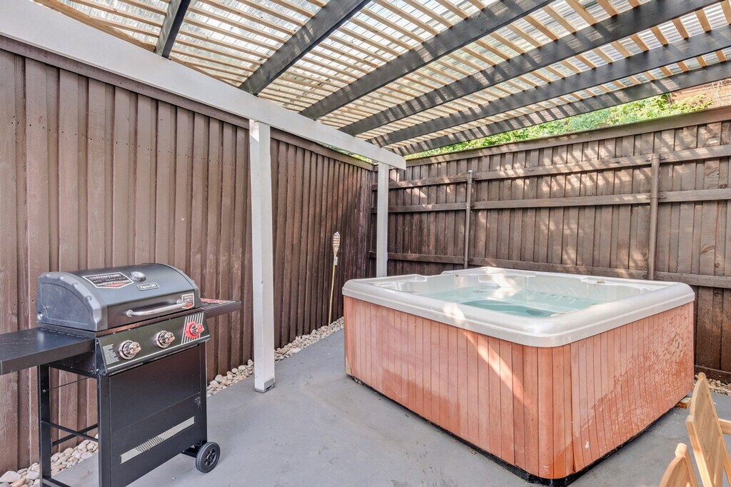 Feel at home in this centrally located Dallas retreat, featuring four bedrooms and two bathrooms. This modern and cozy single-level home is beautifully designed to provide the perfect setting for relaxation and celebration. Unwind in the gorgeous hot tub for the ultimate relaxing experience after a day of activities, making it an ideal place to create lasting memories with family or friends. The sleeping arrangements include a king-size bed in the primary bedroom, queen beds in the second and third bedrooms, and two twin-over-twin bunk beds in the fourth bedroom. The primary bedroom features an en-suite full bathroom, while a second full bathroom serves the other rooms. The fully loaded kitchen is perfect for preparing meals, complete with a large dining table, kitchen bar area, and breakfast nook. Additional amenities include high-speed Wi-Fi, air conditioning, heating, and a washer/dryer. This pet-friendly home welcomes house-trained pets with a fee of $150 per pet per stay. The fourth bedroom will only be opened for groups of six or more guests. The nightly rate includes the first six guests, with an additional fee of $39 per night for each extra guest. Nestled in a quiet suburban neighborhood in Dallas, this home offers a peaceful environment while being close to city amenities. With tree-lined streets and well-maintained homes, it's perfect for guests seeking a calm retreat. Though car-dependent, the area provides easy access to local parks, dining, and shopping, as well as nearby attractions in Dallas. Conveniently located near grocery stores and restaurants, it's just a short drive from the city's vibrant areas. No smoking is allowed inside the property, with a $750 fine for violations. The hot tub is professionally serviced twice a week during the summer and once a week during the rest of the year. Security cameras are installed at the front door and garage for safety purposes, recording 24/7. Check-in is from 4:00 p.m. onwards, and check-out is at 10 a.m. max. Quiet hours are between 10:00 p.m. and 9:00 a.m. Unregistered guests and street parking are not allowed. Any violation of house rules may result in penalties. The home is equipped with high-speed Wi-Fi, making it suitable for remote work-friendly stays. [SI]