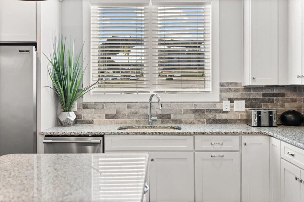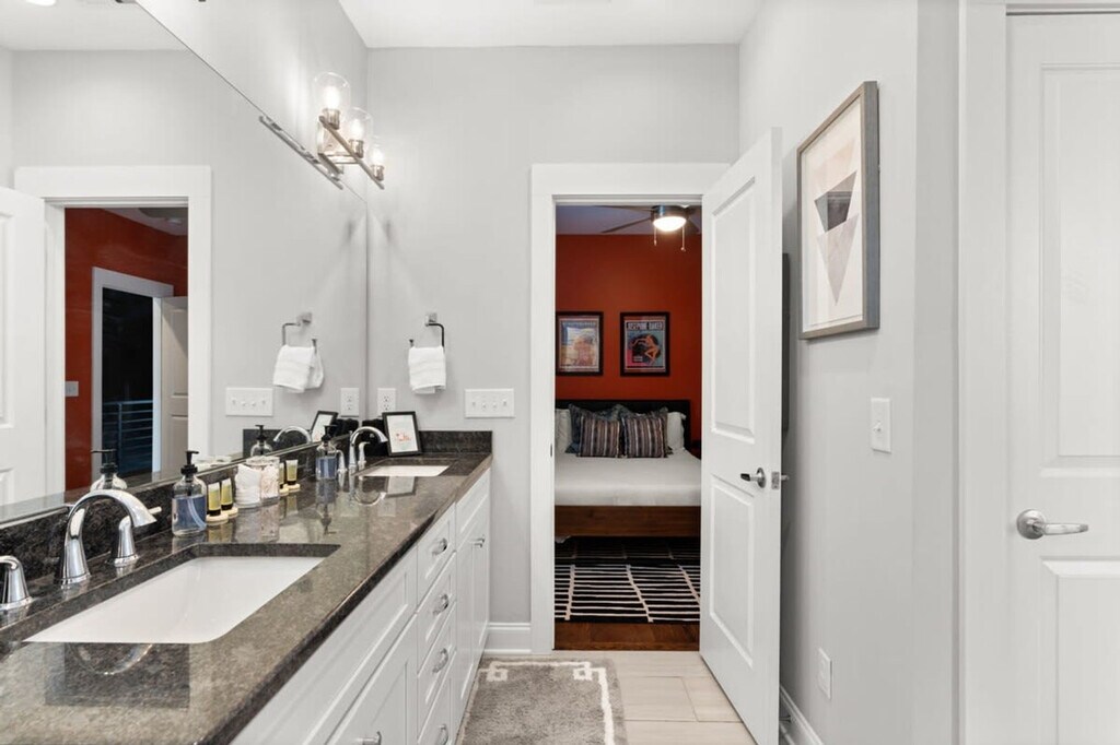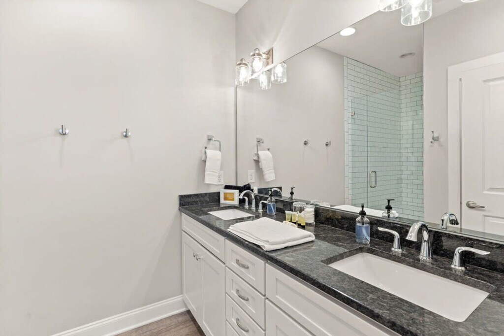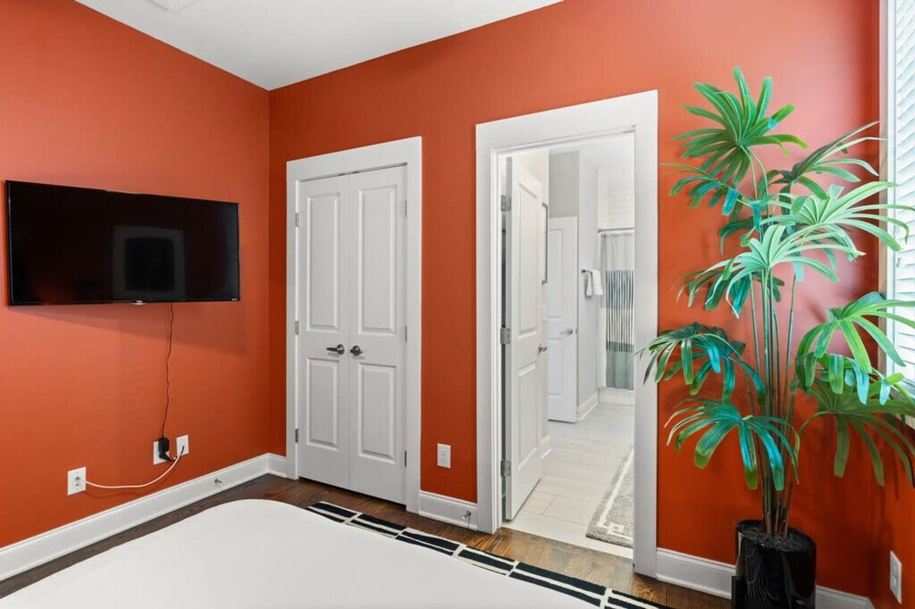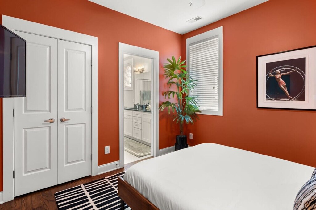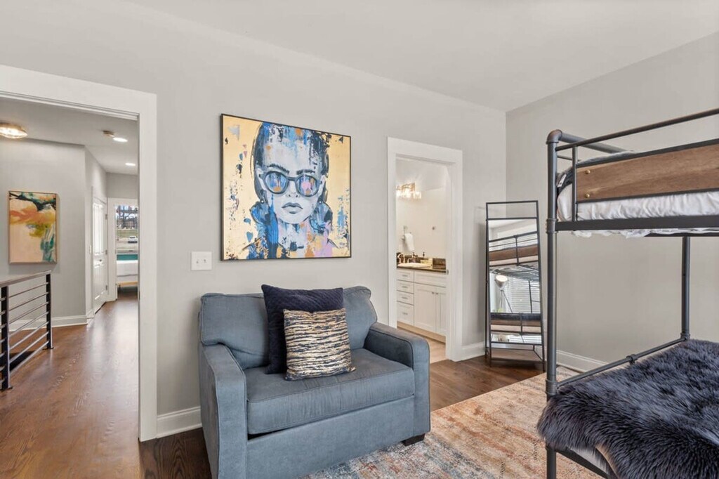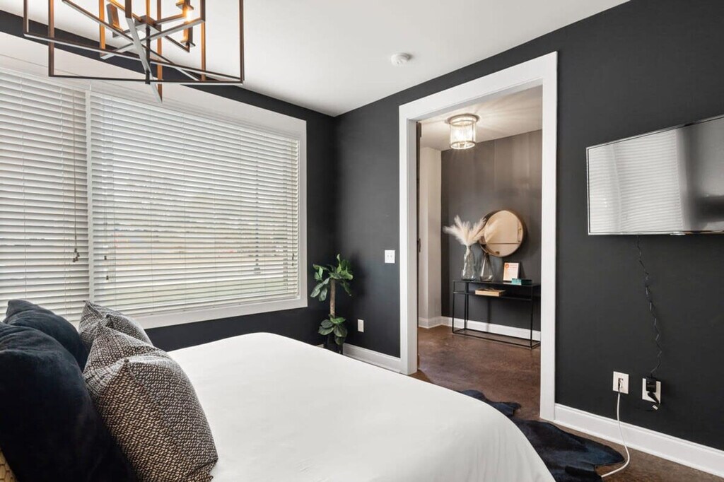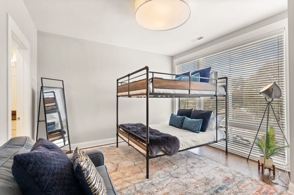 Immerse yourself in the vibrant Wedgewood-Houston neighborhood at this elegant three-story retreat, just 2.5 miles from Downtown and steps from GEODIS Park. Sleeping up to 12 guests, it offers a king bed, two queens, queen bunk beds, and queen and twin rollaways. Enjoy a new rec room, parking for two cars, and easy access to restaurants, bars, and shops within 10 minutes. Conveniently close to BNA Airport with seamless Uber and Lyft options, this home is your gateway to Music City luxury. This contemporary 2000 square foot home in Nashville’s trendy Wedgewood-Houston area is thoughtfully decorated and set up with all the amenities you would find in a hotel, including a super fun brand new game room. Although breakfast is not served, there is complimentary coffee, tea, and light snacks. The home features a fully equipped kitchen with cookware, dishware, and some spices, a drip coffee maker with beans and a grinder, and a laundry room with a full-size washer and dryer. Parking is available for two cars only in front of the garage doors marked “F”. Please respect the neighbors and do not park in front of their garages. Dogs are welcome with specific rules: up to two dogs under 50lbs are allowed, they must be leashed when outside, and guests must pick up after them using the provided dog bag station. Dogs are not allowed on furniture or beds and should be crated if left alone inside. Wedgewood-Houston is one of Nashville’s fastest developing neighborhoods and home to Geodis Stadium. It's an eclectic area filled with a mix of vintage cottages and new homes and home to some of Nashville’s best restaurants, coffee shops, distilleries, and art galleries. Uber and Lyft are great to use in Nashville, typically costing $10 or less to get around. If you decide to rent a car, the driveway can only park two cars. The home is 8.3 miles from BNA Airport, 2.8 miles from Downtown Broadway, and close to other major attractions. No decorations may be adhered to the walls, fixtures, or furniture, and failure to follow this will result in a fine. No smoking is allowed inside the property, and if smoking outdoors, please keep doors and windows closed. Absolutely no major parties are allowed, and small celebrations must be notified when booking. Quiet hours are from 10:00 p.m. to 8:00 a.m. The home is equipped with Ring cameras at the exterior entrances and a NoiseAware noise level indicator inside. Early check-ins or late check-outs must be pre-arranged, and any non pre-arranged late check-outs will result in withholding of deposit. An additional $10 per night per additional guest up to 12 guests maximum. Please ensure all doors are shut and locked when not in use and do not leave valuables in your vehicle if parked on the street. The dining table for eight and a counter height island with stools in the kitchen area can serve as a work desk. Wi-Fi is available throughout the home. Registration Number: