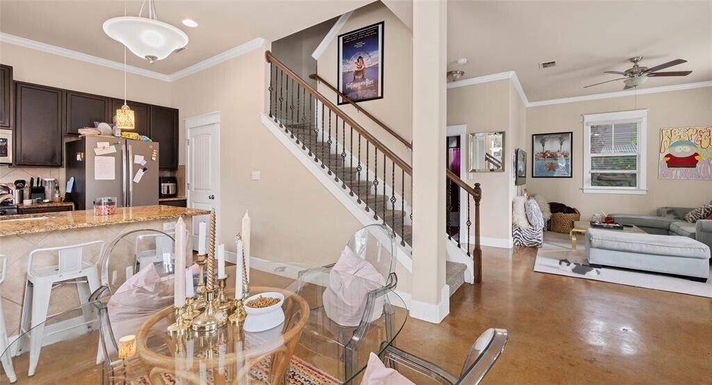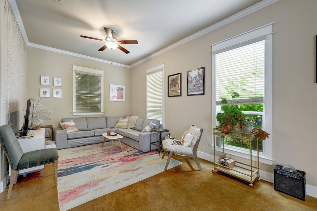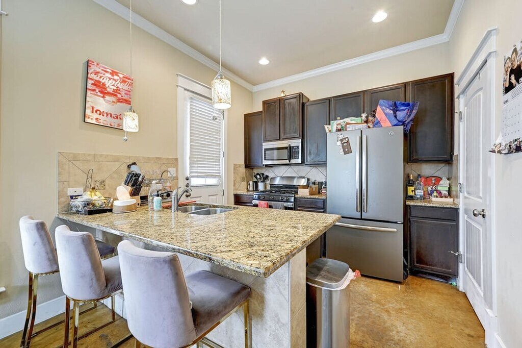Pre leasing for August 1st: Inviting two-story duplex with an open entry leading seamlessly to the dining and kitchen area. The kitchen boasts stainless steel appliances and a bar counter, perfect for entertaining guests. Downstairs, discover stained concrete floors, a bedroom suite, and a bathroom. Ascend the wood staircase to find three additional bedrooms and bathrooms upstairs, all featuring a shower/tub combo. Wood flooring graces the second floor, while each bedroom offers ample closet space. Outside, enjoy the privately fenced backyard with lush trees. Conveniently situated near downtown Austin and The University of Texas, with 1 carport/assigned parking space included. MLS ID 3249853