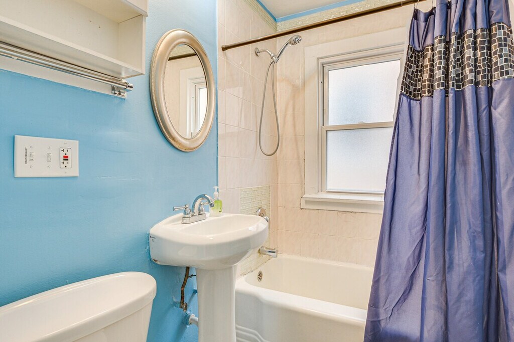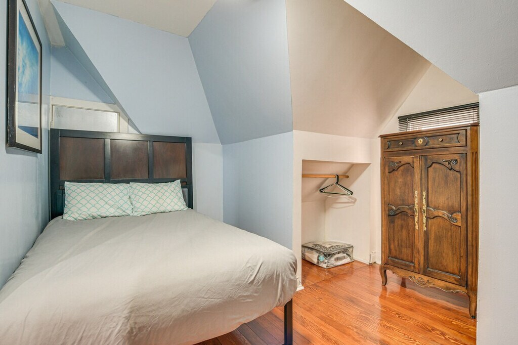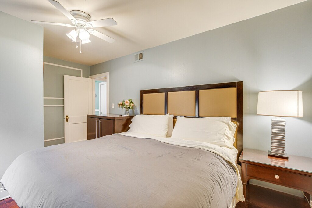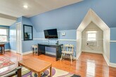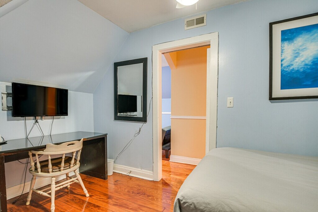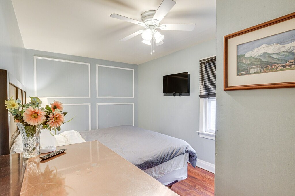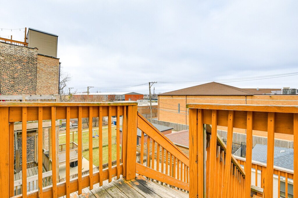 Feel at home in this Chicago vacation rental, nestled in the Washington Park neighborhood. This 2-bedroom, 1-bath apartment is on the 3rd floor of the building and requires exterior and interior stairs to access. The interior stairs leading to the property are steep. This apartment features smart TVs, board games and books, and a deck. The kitchen is equipped with a refrigerator, stove/oven, drip coffee maker (coffee provided), blender, toaster, microwave, cooking basics, dishware and flatware, trash bags and paper towels, and a dining table. Linens and towels, shampoo and conditioner, body wash, and a hair dryer are provided. Additional amenities include free Wi-Fi, window AC units, electric heat, ceiling fans, an iron and board, and hangers. From this apartment, you can easily access top neighborhood sights, like the University of Chicago, or ride downtown for in-office days and city must-sees. The apartment is located 7 miles from The Loop. The homeowner lives on-site, in a completely separate unit, and may be present during your stay. There are 6 exterior security cameras. Camera 1 is a doorbell device with an exterior security camera facing the front outdoor entry, cameras 2-5 are on each corner of the building facing the building's perimeter, and camera 6 is over the garage facing the building's perimeter. The cameras do not look into any interior spaces and record video and sound when activated by motion. The backyard space is not available for guest use. Smoking, pets, events, parties, and large gatherings are not allowed. Includes a workspace in bedroom 2. Guests will have access to the entire property via self check-in. [SI]