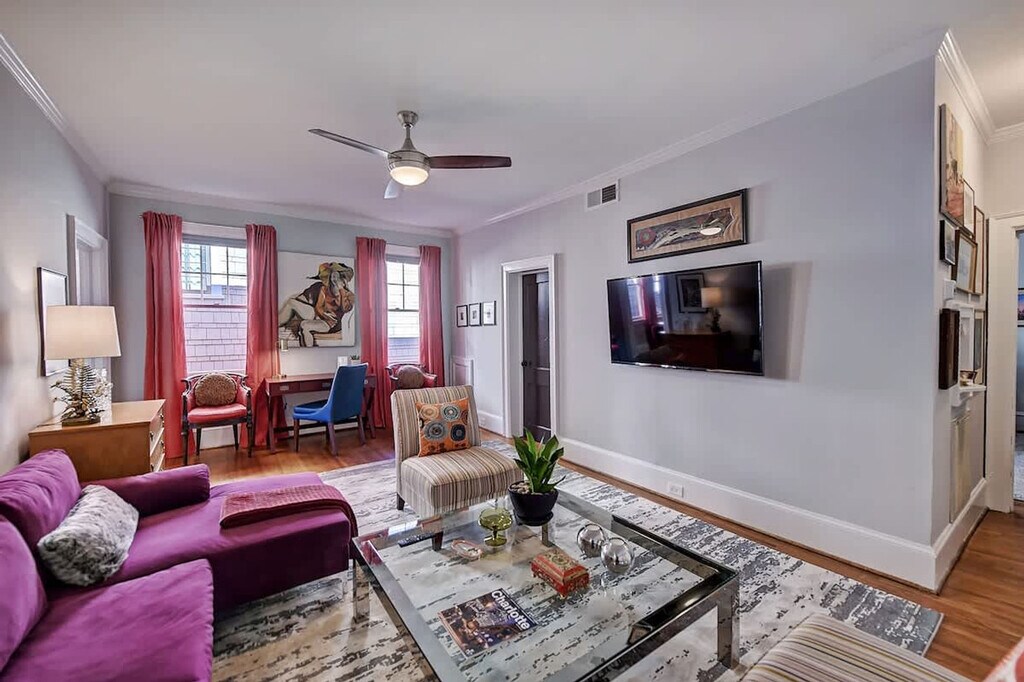 Feel at home in this recently refurbished second-floor apartment in the stately Milton apartment building, located in the desirable and walkable Elizabeth neighborhood. This apartment is one of four chic condos in the building, two of which have 2-bedrooms and two of which have 1-bedroom. Large double-hung windows let in an abundance of natural light in all rooms. This apartment includes a fully equipped kitchen with quartz counters and stainless appliances, ultra-fast Wi-Fi, Hulu Live TV, and an in-unit washer and dryer. The bathroom has modern bath fixtures and tiled walls and floor, and Nest toiletries are included. Artwork by local artist Nico Amortigui is showcased. Complimentary snacks and beverages are provided. In the spacious living room, upholstered furniture provides comfortable seating, and a large flat-screen television provides entertainment with both streaming and Hulu Live. The adjacent dining room comfortably seats four and has all the place settings. Ample storage in the apartment makes it ideal for long-term guests. On-site parking is available. A 7-day pass to Charlotte’s biggest and best fitness center, the Dowd Y, is available for $50. A workstation is available for rent during your stay, which includes two 32” monitors, a wireless keyboard, and a mouse. Registered dogs are welcome at a cost of $59 per dog (two maximum). Located in historic Elizabeth, this residence is conveniently located a few steps from Hawthorne Avenue, the heart of Charlotte’s healthcare district. Plaza Midwood and Upton are a short ride away on the streetcar. This incredibly safe community provides an ideal place for walking or jogging, and you are just a short stroll to Charlotte’s most vibrant nightlife. Within a half-mile walking distance are more than 40 locally owned restaurants (Italian, Mexican, Cajun, and Mediterranean). Just down the street is Independence Park, Charlotte’s oldest park. Enjoy a pleasant 5-minute walk for easy access to uptown by using the Charlotte streetcar! Quiet hours are between 10 pm and 7 am. Dogs are never allowed on the furniture or bed. If there is hair on the furniture, excess hair in the home, stains, damage, or waste found in the yard or home, you will be charged an additional fee. Only two dogs are allowed per stay unless otherwise approved. Smoking and vaping are not allowed inside or outside the home or building. To maintain a peaceful environment, parties, additional guests, events, or large gatherings are not permitted. Guests must be at least 21 years old to make a reservation, and this rule is strictly enforced. [SI]