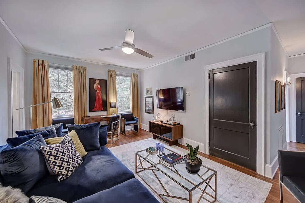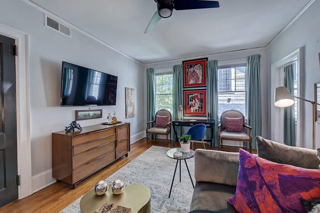 Feel at home in these recently refurbished second-floor apartments in the stately Milton apartment building, located in the desirable and walkable Elizabeth neighborhood. These apartments are accessible via stairs, as they are located in a walk-up building. Each apartment includes a fully equipped kitchen, ultra-fast Wi-Fi, Hulu Live TV, and an in-unit washer and dryer. The kitchens feature quartz counters and stainless appliances and are fully equipped with pots, pans, and utensils. Each residence showcases artwork by local artist Nico Amortigui. Complimentary snacks and beverages are provided. The living room offers comfortable seating with upholstered furniture, a large flat-screen television with streaming, and a desk. Ample storage in the apartment makes it ideal for long-term guests. The bathroom has modern bath fixtures and tiled walls and floor and includes Nest toiletries. On-site parking is available. A 7-day pass to Charlotte’s biggest and best fitness center, the Dowd Y, is available for $50. A workstation is available for rent during your stay, including two 32” monitors, a wireless keyboard, and a mouse. If you are traveling with a dog, it must be registered at a cost of $59 per dog (two maximum). Located in historic Elizabeth, these apartments are conveniently located a few steps from Hawthorne Avenue, the heart of Charlotte’s healthcare district. Plaza Midwood and Upton are a short ride away on the streetcar. Within a half-mile walking distance are more than 40 locally owned restaurants (Italian, Mexican, Cajun, and Mediterranean). Independence Park, Charlotte’s oldest park, is just down the street. Quiet hours are between 10 pm and 7 am. Dogs are never allowed on the furniture or bed. If there is hair on the furniture, excess hair in the home, stains, damage, or waste found in the yard or home, you will be charged an additional fee. Only two dogs are allowed per stay unless otherwise approved. Smoking and vaping are not allowed inside or outside the home or building. Parties, additional guests, events, or large gatherings are not permitted in the property. Air conditioning must remain between 72 and 75 degrees in the summer and 68-72 in the winter and on AUTO to help ensure it stays in good working condition during your stay. If you do not register your dog, you will be charged $120 per dog. Guests must be at least 21 years old to make a reservation, and this rule is strictly enforced. [SI]