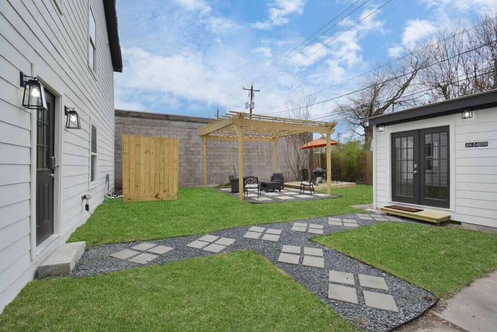 Introducing “La Casita” – a beautifully designed and fully furnished efficiency unit offering style,privacy,and comfort. This charming detached space features an inviting exterior with French doors,modern lighting,and a private walkway leading to your entrance. Inside,enjoy an open layout with warm wood-style flooring,recessed lighting,and tasteful furnishings including a cozy bed,sofa,coffee table,and dining set. The kitchenette is equipped with a mini-fridge,sink,open shelving,and ample counter space for easy meal prep. Large windows fill the space with natural light while offering serene views of the fenced yard. The bathroom boasts a sleek pedestal sink,modern fixtures,and a tiled walk-in shower. Outdoors,relax under the pergola in the shared yard or enjoy your own quiet retreat. Perfect for a guest house,short-term rental,or personal escape,La Casita blends modern amenities with low-maintenance living in a prime Houston location. MLS# 82264656