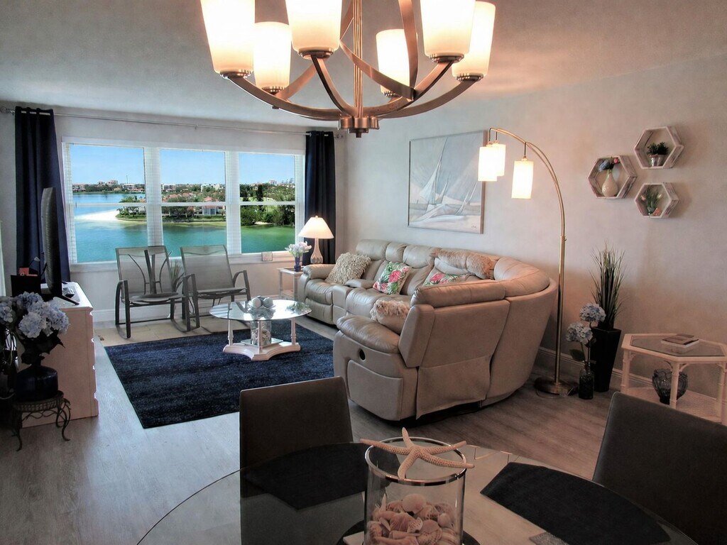 WELCOME to this stunning renovated waterfront condo - available for 6 to 12 MONTHS (SIX MONTH MINIMUM). THIS IS A 55+ COMMUNITY. Completely furnished two bedroom, two bath (split plan) with gorgeous NEWER kitchen featuring wood soft close cabinetry, engineered quartz counters with large peninsula, beautiful stainless LG appliances, luxury vinyl plank flooring throughout, new lighting & lovely furnishings! Water views from each room! PLUS PLUS PLUS! This 8th floor beauty also has hurricane rated windows and a rare BALCONY overlooking Boca Ciega Bay! Primary BR has KING size bed, tv, dresser, HUGE walk-in closet, and en suite bath with step-in shower. Bedroom 2 has queen bed, tv, dresser and walk in closet. Laundry room just two doors down with full size front loader machines and sink for your use at no charge. Point Brittany is a gated 55+ community with multiple waterfront heated pools, grilling area, clubhouse, fitness, tennis, pickleball, shuffleboard, boat slips and many other amenities (salon, ballroom, country food & wine store, doctor's office). Tenant will pay electric. Water/sewer/garbage/ext. cable, Internet & WiFi are included in the rent. Assigned parking space on ramp (2nd level outside). Sorry, NO PETS allowed per condo rules. Only short 8-10 min. drive to St. Pete Beach OR Downtown St. Pete. What a great space to relax, re-group, explore the area, take a time out, and plan for your next residence!