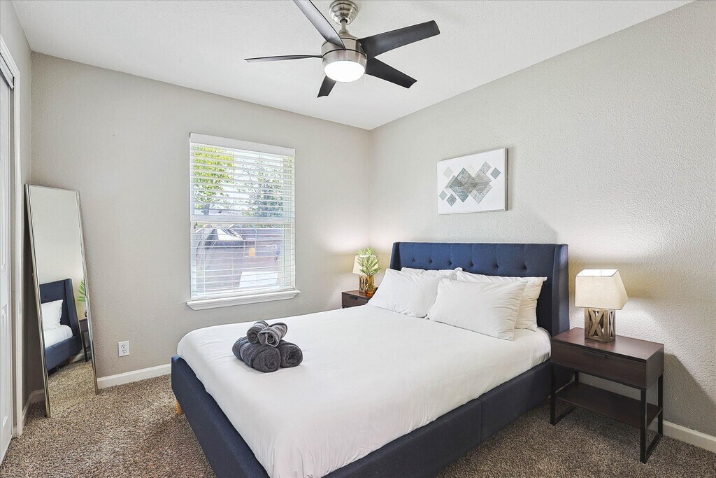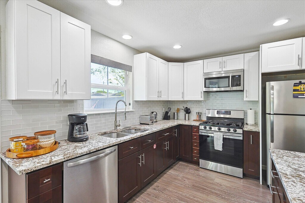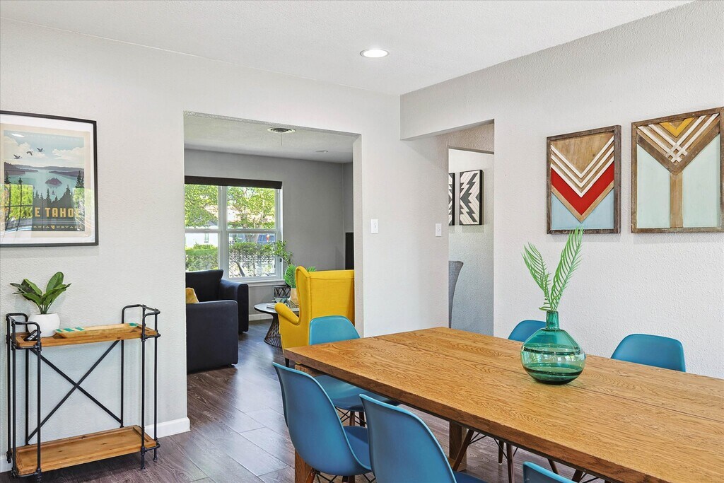 Fully furnished!! A bright sun filled kitchen is perfect for a lazy weekend morning. Cook brunch and enjoy the spacious garden and pool as you plan your day downtown. The living room invites you to sit down with its popping colors and 60” TV. The cornered sofa is extra-cozy and large enough to fit your entire party. Eye-catching artwork decorates the walls and adds chic flair to your stay. Three bedrooms give everyone enough private space to keep to themselves. The master suite has kind bed and attached bathroom, the second bedroom has a queen bed, and the third bedroom has two bunk beds. Two bathrooms in the house. Both have a shower, are stylishly decorated, and recently renovated. You will find the laundry room fully equipped with a washer/ dryer, baby crib and highchair, vacuum and cleaning products. Please feel free to use any and all! Our back yard is spacious and safe, perfectly fenced in to make any parent with little munchkins feel relaxed and secure. Enjoy alfresco meals under the stars on our outdoor dining set. Our garage can fit ONE car, ONE more can fit in the driveway and TWO more can easily park on the street in front of the house. If you plan on bringing more than FOUR cars, please let us know first so we can help make arrangements.