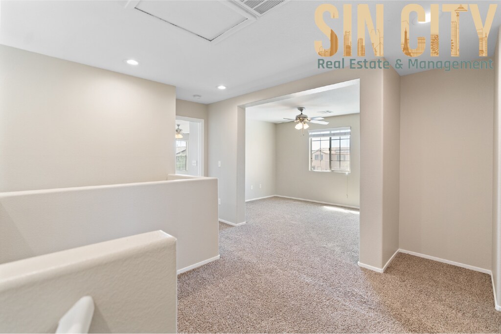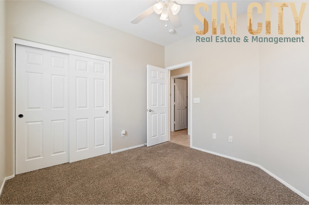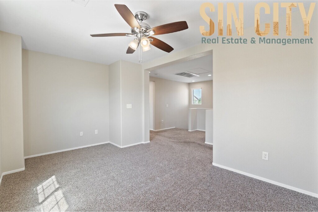 Modern move in ready home located in a gated community with access to a community pool and a park right next door. Low-maintenance desert landscaping in the front yard and synthetic grass in the backyard. Tile flooring throughout the great room and kitchen. One bedroom and bath conveniently located on the main level. The kitchen features granite countertops, a reverse osmosis filtration system, stainless steel sink, refrigerator, microwave, and pantry. The primary suite includes dual vanity sinks, a separate soaking tub and shower, and a walk-in closet. Ceiling fans throughout. Laundry room located upstairs. All Sin City Real Estate and Management LLC residents are enrolled in the Resident Benefits Package (RBP) for $45.00/month which includes liability insurance, credit building to help boost the resident’s credit score with timely rent payments, HVAC air filter delivery (for applicable properties), and much more! More details upon application * optional First Months rent Security Deposit $175 Lease Prep Fee $45 Resident Benefit Package *optional Sin City Real Estate and Management LLC Alexis Quintanilla B.1003001.LLC