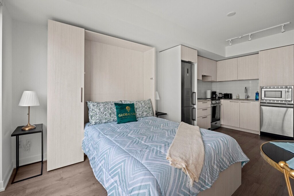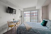 Feel at home in this new luxury studio suite in "The Teahouse Condo" by Prestigious Lanterra, located in the high-demand downtown core and offering a great view of the city. This comfortable suite has everything you need. The fully functional kitchen includes supplies such as tea, coffee, a kettle, coffeemaker, and toaster. A washer and dryer are available with supplies. The bathroom includes towels, shampoo, conditioner, body wash, a hair dryer, and other toiletries. Underground parking with in/out privileges is available upon request for an additional fee of $25 per night. It's recommended to request it in advance as spaces may be limited. In case of no availability, there is paid underground parking nearby. Pets are allowed with a fee of $10 per night for 1 pet. Travel cribs (for 0-18-month-old babies) are available for $5 per item per night; please book these items in advance. The apartment is steps to the subway, Toronto Metropolitan University, office towers, Yorkville, and hospitals, and close to many shops, the Financial District, and Eaton Centre. Guests must be 18 or over in order to check in. According to the condo rules, information about guests must be provided to the condo management prior to their arrival. If you plan a stay with pets, please confirm the opportunity prior to booking. [SI]