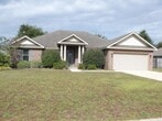 View In 3D: Welcome to this beautifully designed 5-bedroom, 3-bath home located in the quiet and desirable Taryn’s Estates community on the west side of Milton. Offering 2,326 sq. ft. of comfortable living space, this home features a split floor plan that perfectly balances style and functionality. Step through the covered front porch into the inviting foyer with tile flooring flowing seamlessly into the open-concept living area. The kitchen boasts granite countertops, 42” dark wood cabinetry, tile flooring, and a large center island with dual-basin sink. Appliances include a refrigerator with bottom-drawer freezer, flat top range, built-in microwave, and a dishwasher. The expansive primary suite features a beautiful tray ceiling with fan, a walk-in closet, and a luxurious ensuite bathroom with dual vanities, a garden tub, and a separate shower. Four additional bedrooms provide ample flexibility for large families, guests, an office, or a hobby space. Outdoors, enjoy the large covered lanai overlooking the fully fenced backyard, and a storage shed for added convenience.