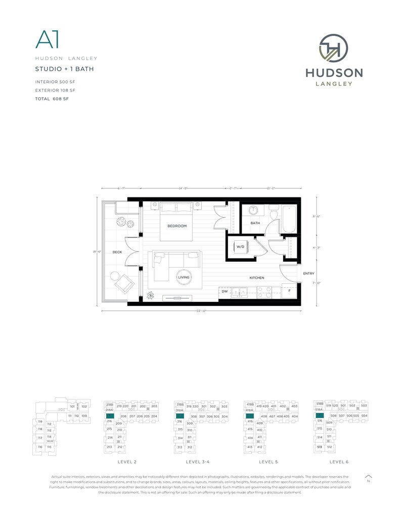 Designed for modern living, this Studio unit features a thoughtful layout with 608 sq. ft. of well-utilized space. The arrangement encourages ease of living, offering flexibility whether you're working, unwinding, or entertaining. Each unit includes a kitchen with full-size LG appliances, in-suite laundry, and independent heat pumps in each bedroom and living space. This unit also features elevated ceilings, enhancing openness and adding a touch of luxury. This blend of thoughtful planning and quality finishes establishes a truly enjoyable living space. Situated in the heart of Langley's growing community, the unit is steps away from Brydon Lagoon, greenway trails, cozy coffee shops, and daily amenities. This connected setting makes errands, recreation, and commuting remarkably easy. The Hudson isn't just another apartment building—it's where modern comfort meets timeless quality. Thoughtfully designed with spacious layouts, premium finishes, and top-tier amenities, The Hudson offers a lifestyle that's as stylish as it is convenient.