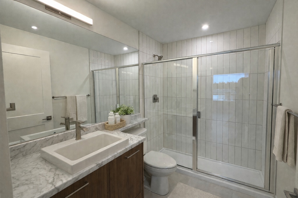 This 2 Bed unit combines contemporary style with a functional 890-sq.-ft. floorplan ideal for comfortable everyday living. Its layout promotes natural flow from room to room, supporting both quiet routines and dynamic daily schedules. Each unit includes a kitchen with full-size LG appliances, in-suite laundry, and independent heat pumps in each bedroom and living space. This unit also features elevated ceilings, enhancing openness and adding a touch of luxury. This blend of thoughtful planning and quality finishes establishes a truly enjoyable living space. Found within Langley's welcoming Brydon neighborhood, this unit places you close to parks, riverside trails, restaurants, and shopping destinations. This connected setting makes errands, recreation, and commuting remarkably easy. The Hudson isn't just another apartment building—it's where modern comfort meets timeless quality. Thoughtfully designed with spacious layouts, premium finishes, and top-tier amenities, The Hudson offers a lifestyle that's as stylish as it is convenient.