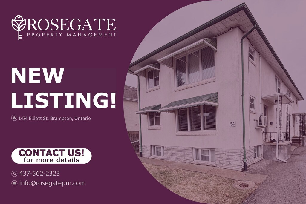 2-Bedroom Corner Apartment with Porch & Parking – Utilities Included – Brampton Welcome to 1–54 Elliott Street, Brampton — a well-maintained corner apartment offering approximately 750 sq. ft. of comfortable living space.This 2-bedroom, 1-bathroom unit features a bright and functional layout, ideal for professionals, couples, or small families.The primary bedroom includes his and hers closets, providing added storage and convenience.The unit also features central heating and air conditioning, along with a microwave for everyday use. Laundry is available on-site with shared washer and dryer.Enjoy a front porch, perfect for relaxing and getting some fresh air.This home includes one parking space, adding convenience to your daily routine.All utilities are included except electricity (hydro), which will be transferred into the tenant’s name, helping keep most monthly costs simple and predictable.Located in a convenient Brampton neighbourhood close to transit, shopping, and everyday amenities, this professionally managed rental offers both comfort and value.Book your viewing today.