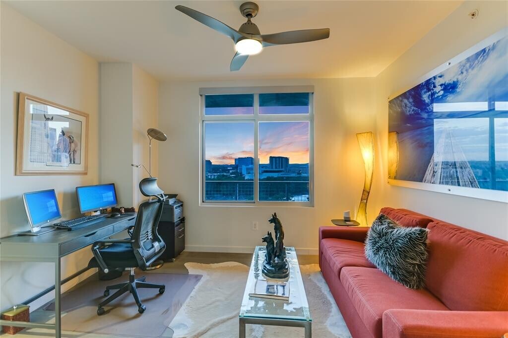 Modern Rainey Retreat | Direct Trail Access + Residents-Only Terrace Live at Milago in a beautifully updated 2-bedroom, 2-bath home in the heart of Rainey Street—where downtown convenience meets the outdoors. This 1,164 sq ft residence has an open layout, hardwood floors, and upgraded kitchen and bathrooms. The standout feature: a rare 3rd-floor setting with direct access to a residents-only community terrace and an open, unobstructed outlook—not facing another building or parking garage. Enjoy views over the dog park and quick access to the Lady Bird Lake Trail right outside the building. Home Highlights • Updated kitchen with quartz-style counters, breakfast bar, and stainless appliances • Bright living area with large windows and modern lighting • Two true bedrooms / flexible split layout for guests or a dedicated office • Both bathrooms upgraded with contemporary finishes • Reserved garage parking included • Pet friendly Milago Amenities • Rooftop pool + separate hot tub • 24/7 Concierge, business center, and enclosed lake-facing patio on the lobby level • Fitness center + resident club room • Secure mailroom + package receiving area Steps from Rainey’s restaurants and nightlife, and unmatched for outdoor access—Milago offers one of the most convenient connections to the Lady Bird Lake Trail.