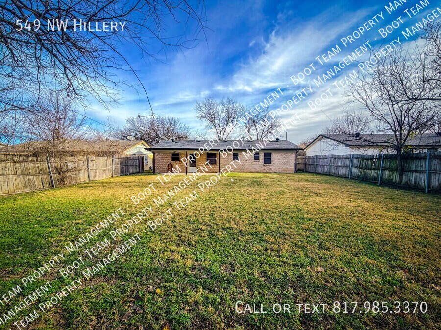 Encompassing the charm and warmth of Burleson, TX, this inviting home at 549 NW Hillery is the perfect haven for those seeking comfort and style. Nestled in a tranquil neighborhood, this delightful residence offers three spacious bedrooms and two full bathrooms, thoughtfully designed to cater to your every need. With a well-utilized 1150 sq ft of living space, the layout provides a seamless flow, ideal for both relaxation and entertaining. The bright and airy interior is complemented by large windows that invite natural light to dance throughout the rooms, creating a welcoming and cheerful atmosphere. The kitchen, equipped to inspire culinary creativity, opens up to a cozy dining area where memorable meals and conversations await. Outside, the charming curb appeal and lush surroundings offer a serene escape from the hustle and bustle of everyday life. Whether you're enjoying a peaceful morning coffee or hosting a lively gathering, this home provides the perfect backdrop for any occasion. Located in the heart of Burleson, with convenient access to local amenities and access to I35, this property is a delightful blend of comfort and convenience. Come and discover the endless possibilities that await you at 549 NW Hillery, where your next chapter begins. Boot Team PM is a security deposit assistance company - All Residents have the option to obtain an Obligo agreement to cover 75% of their security deposit or pay a regular cash deposit equal to 2x the rent. *RESIDENT BENEFIT PACKAGE* ($30 ADDED ON TOP OF RENTAL PRICE) *Renters Insurance Required* Pet fee based on pet rating through Pet approval is case by case. $320 one time fee for third party move in and move out inspections. **NO SMOKING** $75 App fee on all residents 18 years and older. Isd Cooktop Cover Back Porch Fenced Backyard Single Car Garage Vinyl Plank