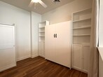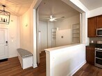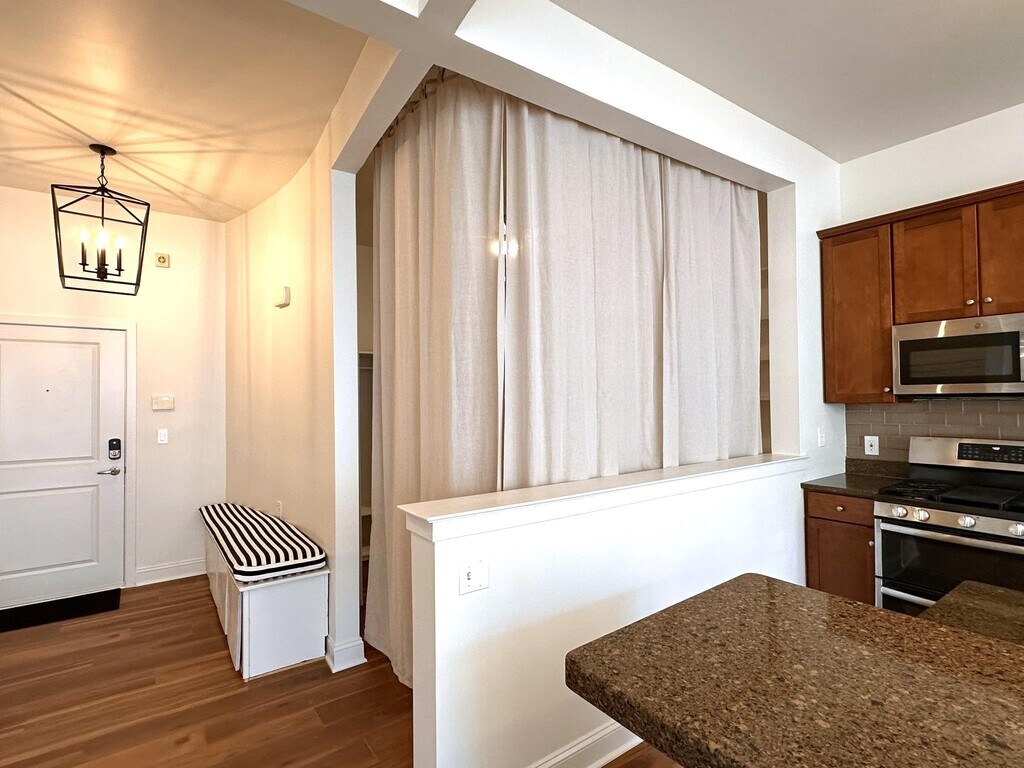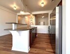 The expansive living area offers plenty of room to relax and entertain, while the kitchen impresses with a large center island, ample cabinet storage, granite countertops, tile backsplash, stainless steel appliances, and gas cooking. A true foyer welcomes you home with a coat closet and built-in bench. The versatile den includes ceiling-track privacy curtains, a Murphy bed, built-in bookcases, and a closet—perfect for guests or a home office. The primary bedroom overlooks the balcony and features a walk-in closet with custom shelving. Enjoy your morning coffee or unwind at sunset on the private balcony. Additional conveniences include in-unit washer/dryer and a reserved garage parking space included in the rent. 2 blocks to the West Side Light Rail Station and close to shopping, dining, schools and parks.