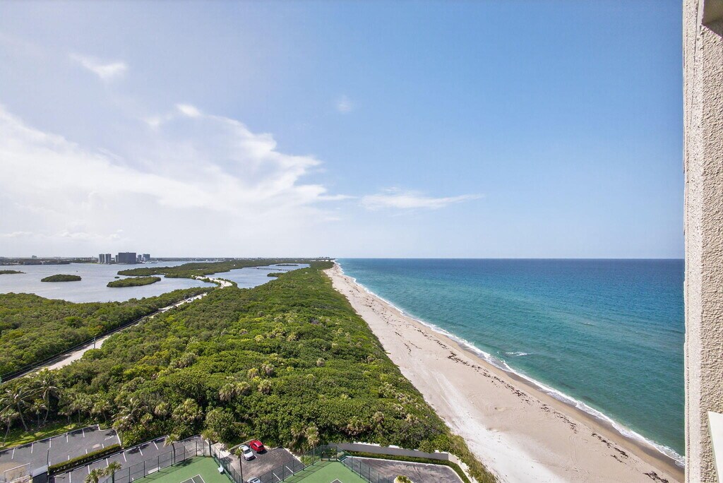 SEASONAL RENTAL - Lease one of the very best views on the island overlooking the pristine northend of Singer Island adjacent to Macarthur State Beach Park. Breathtaking Penthouse ''A'' unit w wrap balcony and extensive ocean and intracoastal views. 2/2 with OPEN kitchen.Queen bed in master and 2 double beds in the guest room. Updated guest room bathroom/shower and washer/dryer is right outside the condo door. Master bath has tub & shower. Flat screen TV's all rooms. Garage covered parking space & hurricane impact doors. Kitchen has Nespresso machine & soda maker for bubbly water. Water Glades Amenities include two pools, private beach access, renovated community room, grills, putting green, tennis courts, lobby, library or media room, manned guard & much more. Access to storage locker.