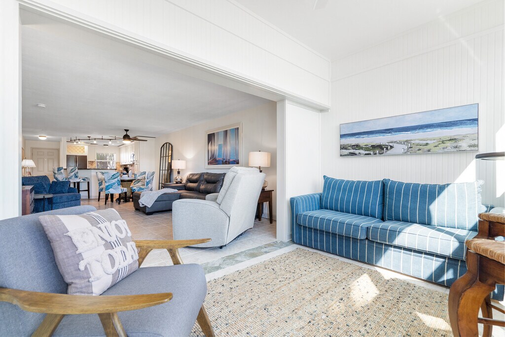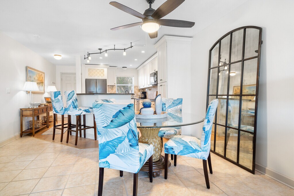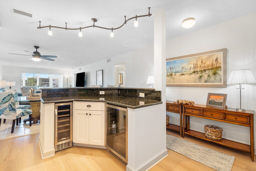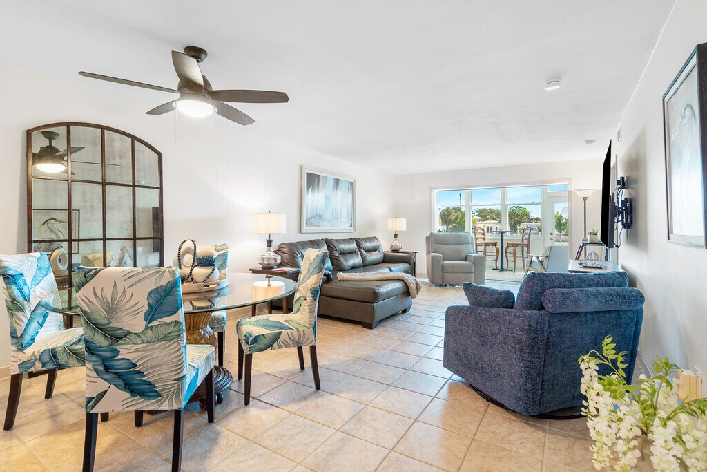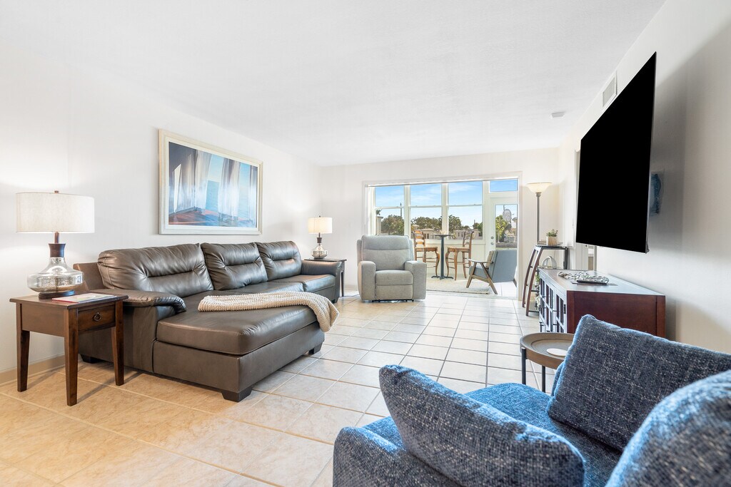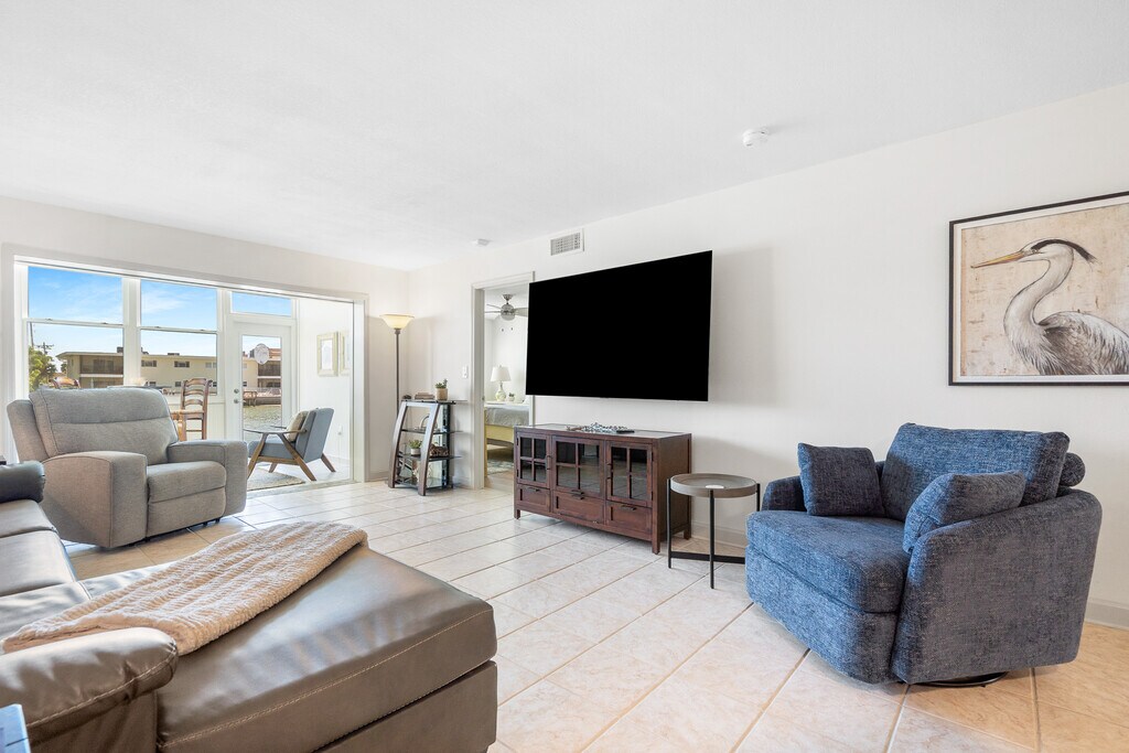 Step into refined coastal living with this beautifully remodeled ground floor condo in the heart of St. Pete Beach, Florida! Recently renovated, this spacious condo offers 2 bedrooms and 2 bathrooms spread across 1,350 square feet, comfortably accommodating up to 8 guests. The open floor plan creates a seamless flow between the living, dining, and kitchen areas, ideal for both relaxation and entertainment. Enjoy spectacular waterfront views from the bonus sunroom, a serene spot perfect for morning coffees or evening cocktails. The kitchen features modern amenities including a wine cooler and mini fridge, perfect for preparing meals and beverages. In the living room, unwind with a movie night on the impressive 85-inch flat screen, adding a touch of luxury to your downtime. Residents have exclusive access to heated pools, a fitness center, and a clubhouse, ensuring every day feels like a resort getaway. Recently upgraded, the exterior of the complex enhances the appeal and comfort of this coastal retreat. Located just steps from Gulf Blvd, the condo offers easy access to St. Pete Beach and a variety of nearby activities, perfect for enjoying the best of beachside living. This property rents for $3000 per month for an annual or for seasonal and peak winter and spring season the rates are November and December $4000 a month and $5000 a month January 1 to April 30th. For an annual lease, First, last, security, background and credit check, and a $250 cleaning fee are due. HOA renter application due with signed contract. This property requires a minimum rental period of 90 days, with utilities included for any stay of 3 to 5 months. For rentals lasting 6-12 months, Duke Energy is renter responsibility.