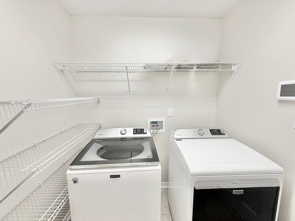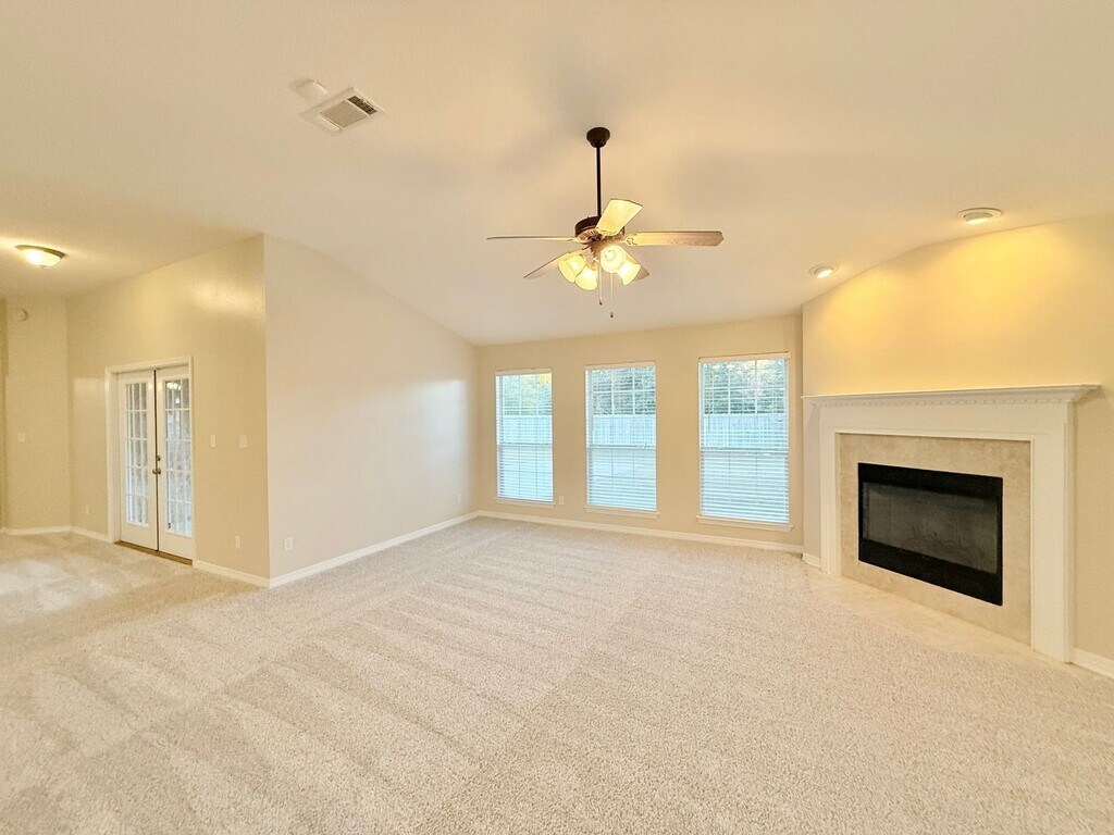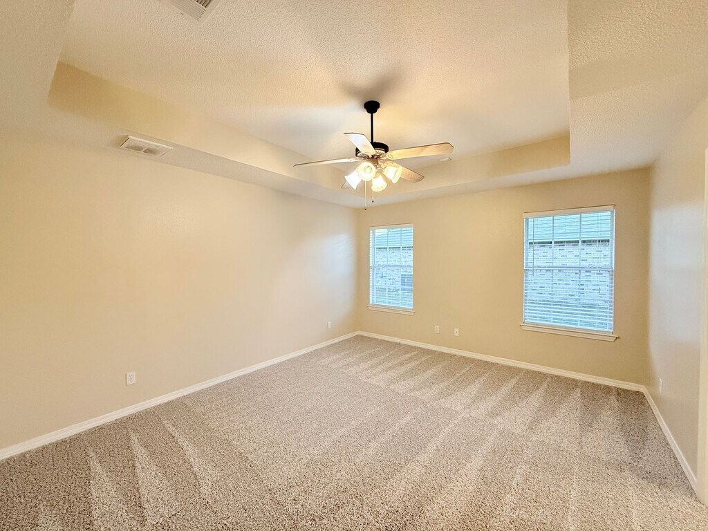 View In 3D: Welcome to this spacious 4-bedroom, 2.5-bath home with 2-car garage, located in the desirable Tanglewood subdivision near Tanglewood Golf Course. Enter through the elegant double archways leading to the great room with vaulted ceiling, corner fireplace, and views of the private backyard. The large, open kitchen is the heart of this home, featuring Corian countertops, a center island, breakfast bar, walk-in pantry, and stainless steel appliances including a refrigerator, flat top range/oven, built-in microwave, and dishwasher. The primary suite offers a tray ceiling with ceiling fan, and an ensuite bath with dual vanities, garden tub, glass-door shower, private water closet, and a 15-foot walk-in closet with abundant shelving. Two additional bedrooms share a Jack-and-Jill bath, while the fourth bedroom makes a perfect office or study. Additionally, enjoy the large, fully-fenced backyard with covered patio, extended paved area, and storage unit, as well as a dedicated laundry room with full-size washer and dryer provided.