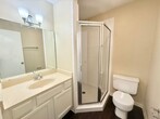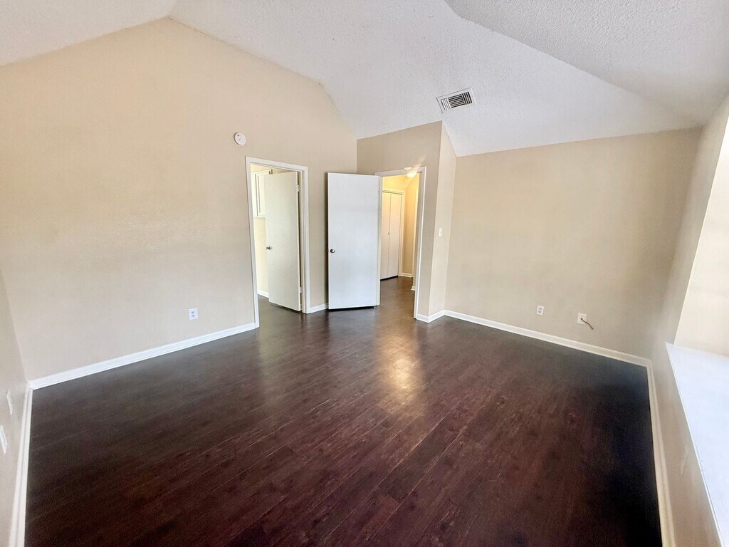 Quiet neighborhood with community pool steps away from your front door. Master bedroom with ensuite 2nd bedroom with spacious closet and window seat. 2nd bathroom shower newly renovated Laundry hook up in unit Stove and dishwasher provided Spacious back patio 2 parking spaces for this unit Hardwood floors throughout Vaulted ceilings Large windows with blinds provided