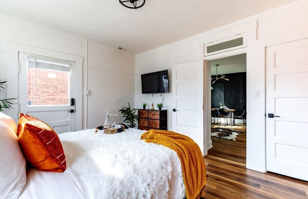 Feel at home in this 2-bedroom apartment in Columbus, Ohio. Located on the second floor, there is a flight of steps to reach the front door at the back of the home. This apartment features original hardwood floors, a fully equipped kitchen, high-speed internet, and smart TVs in the living room and bedrooms. For your comfort, there are tower fans and white noise machines, a hair dryer, and a handheld steamer. Pets are welcome for a fee of $35 per pet per night (up to $300 cap per pet for the entire stay). Street permit parking is available for one vehicle. Additional street permit parking is available for $10 per additional vehicle for your entire stay. Centrally located, this apartment is near restaurants and bars on North High Street, The Book Loft of German Village, Scioto Audubon Metro Park, the Greater Columbus Convention Center, Nationwide Arena Stadium, and Ohio State University. Some city or neighbor noise is possible due to the central location and shared wall with a neighboring unit; white noise machines and fans are provided. Quiet hours are from 9 p.m. to 7 a.m. No loud music, parties, small gatherings, or events are allowed. Smoking, marijuana, firearms, illegal substances, or any illegal activity are prohibited on the property; smoking is allowed outside only. No additional unregistered guests are allowed. Tampering with exterior surveillance, noise monitors, and smoke sensors will lead to immediate cancellation with no refund, as well as a $500 violation charge. Any late check-outs will result in an additional charge of $300. Breaking any of the house rules will result in a charge of $500 each, subject to a charge per occasion and per broken rule separately. For any undisclosed pet, a $500 charge will apply. Registration Number: 20234440 [SI]