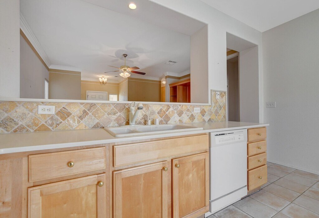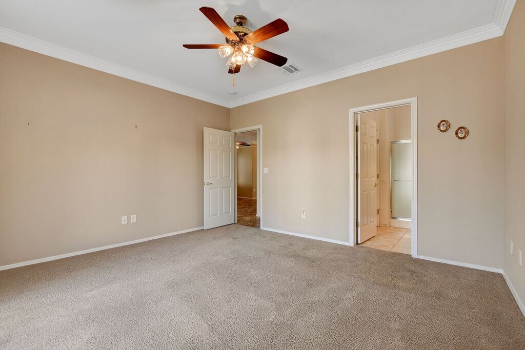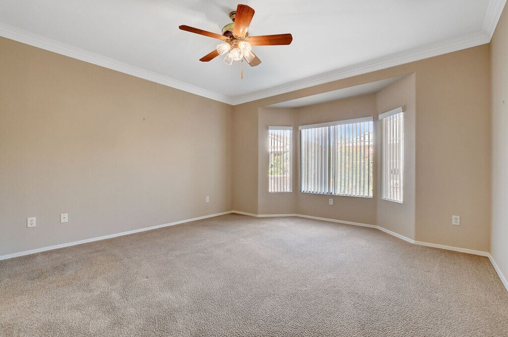 This charming home welcomes you with its beautiful desert landscaping, convenient layout, and gorgeous crown molding. The spacious kitchen and primary room have plenty of natural light from the stunning bay windows. The primary bath has a walk in shower and the second bathroom has a shower/tub combo so you get the best of both worlds!