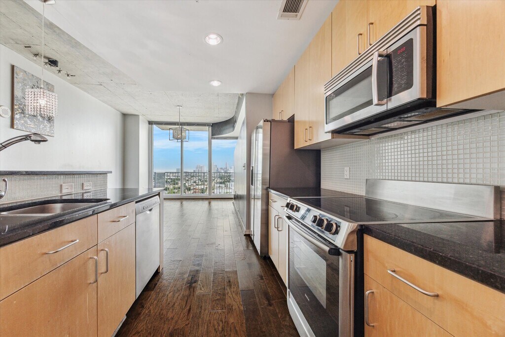 Sky-high living on the 20th floor of Mosaic at Hermann Park! This oversized 1-bed plan showcases postcard Downtown views from a private balcony framed by floor-to-ceiling glass. Engineered hardwood leads to an island kitchen—breakfast bar plus refrigerator,washer & dryer INCLUDED. The owner’s suite pampers with double vanity,soaking tub,shower and walk-in closet,while guests enjoy a separate powder bath. Priced to move and perfectly positioned at the junction of 288,59 & 45 for quick commutes,nonstop nightlife and entertainment—and only steps to Hermann Park trails and golf. Amenities: 24-hr valet & concierge,one-acre resort pool deck with cabanas,fire pits,outdoor kitchen & spa; 6,000 sf social lounge with pool & ping-pong; club-level fitness center featuring boxing gym,steam & sauna! Take a closer look—your high-rise lifestyle starts here! MLS# 98882606