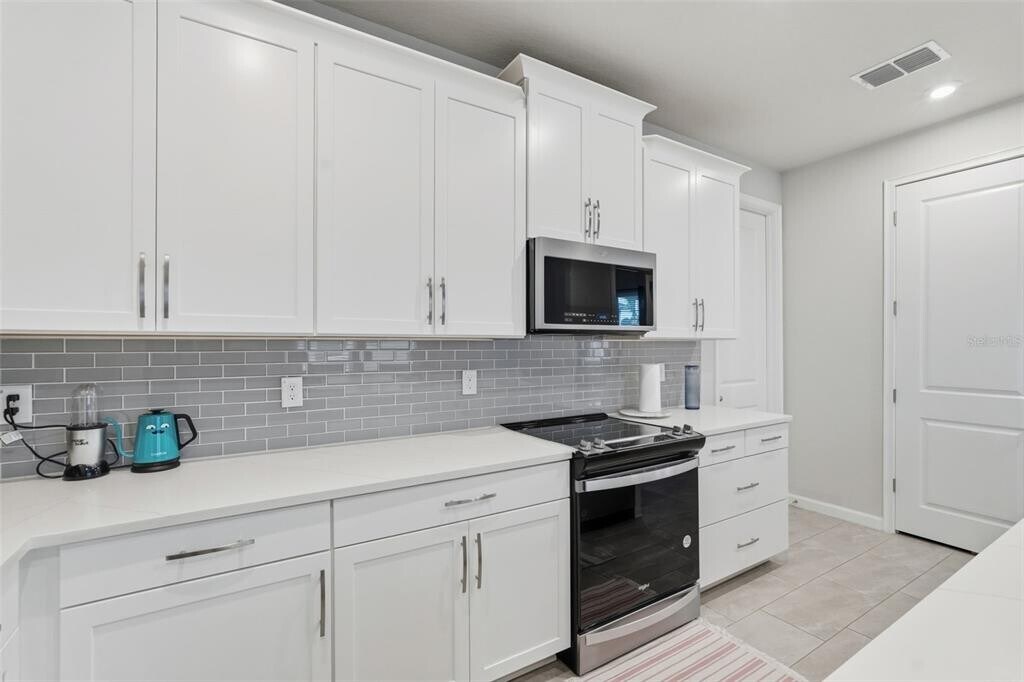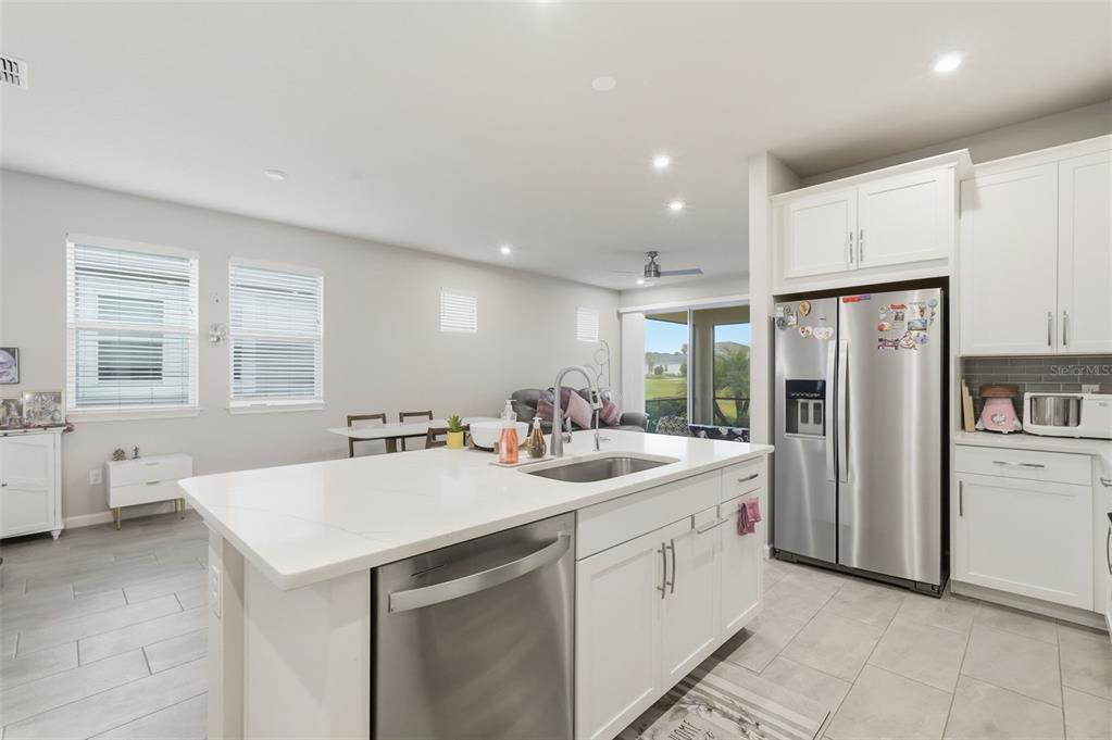 Villa with 2 bed 2 bath and office/flex room. This stunning "Largo" villa is located in Timberdale at the popular new community of Chapel Crossings in Wesley Chapel. This 1,431 square foot Largo open floor plan offers two bedrooms including a spacious owner's retreat, two bathrooms, a Study and a two car garage. The inviting exterior boasts a paver driveway, walkway and entryway and a lush landscaping package. Planned throughout the interior are shaker style cabinets with 42-inch uppers in the kitchen quartz countertops and a tile backsplash. Wood inspire tile flooring runs throughout all the common areas. This home also features a large screened in paver lanai, and finishes like stainless steel appliances, including the refrigerator, and cabinet hardware. The amount of natural light the upgraded 12' sliding door gives the feeling of a space much larger than the square footage would suggest. The owner's suite is large enough for a king sized bed and has en suite with oversized shower, dual sink raised vanity and walk-in closet. Bedroom 2 is located at the front of the home with a full secondary bathroom. The study is located just off the foyer and makes a great space for home office, hobby room or even formal living! The front porch even has room for rockers or a small seating area.
