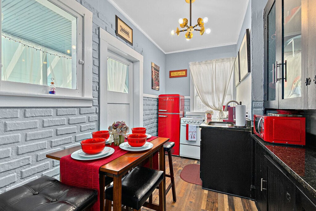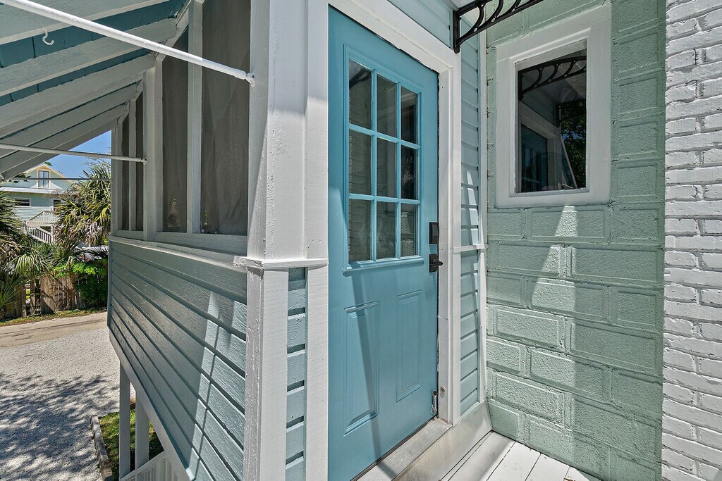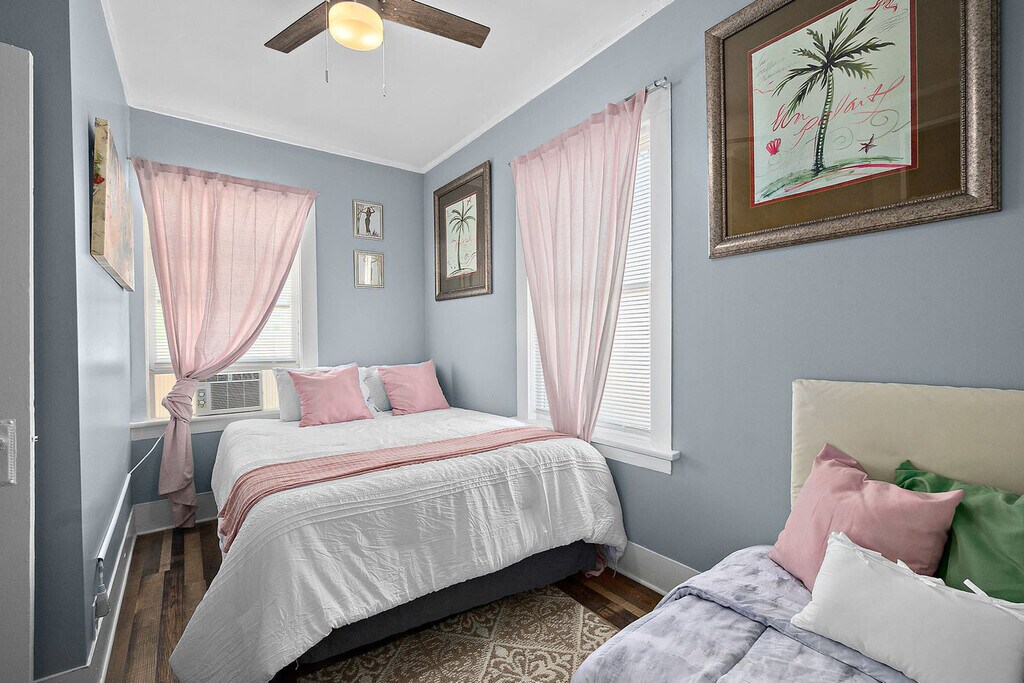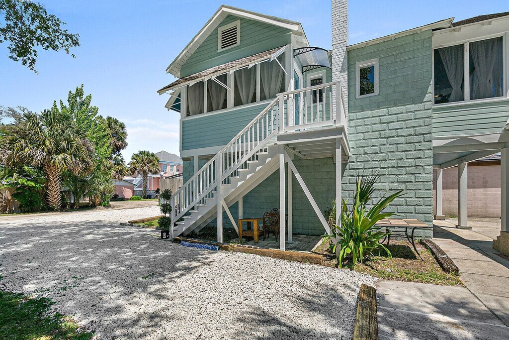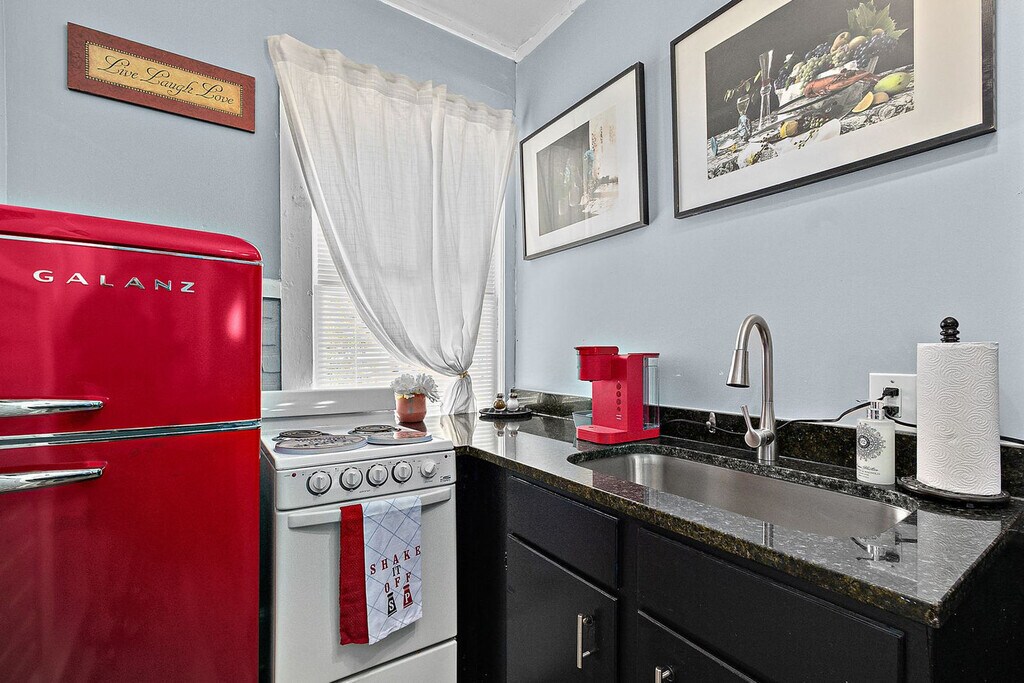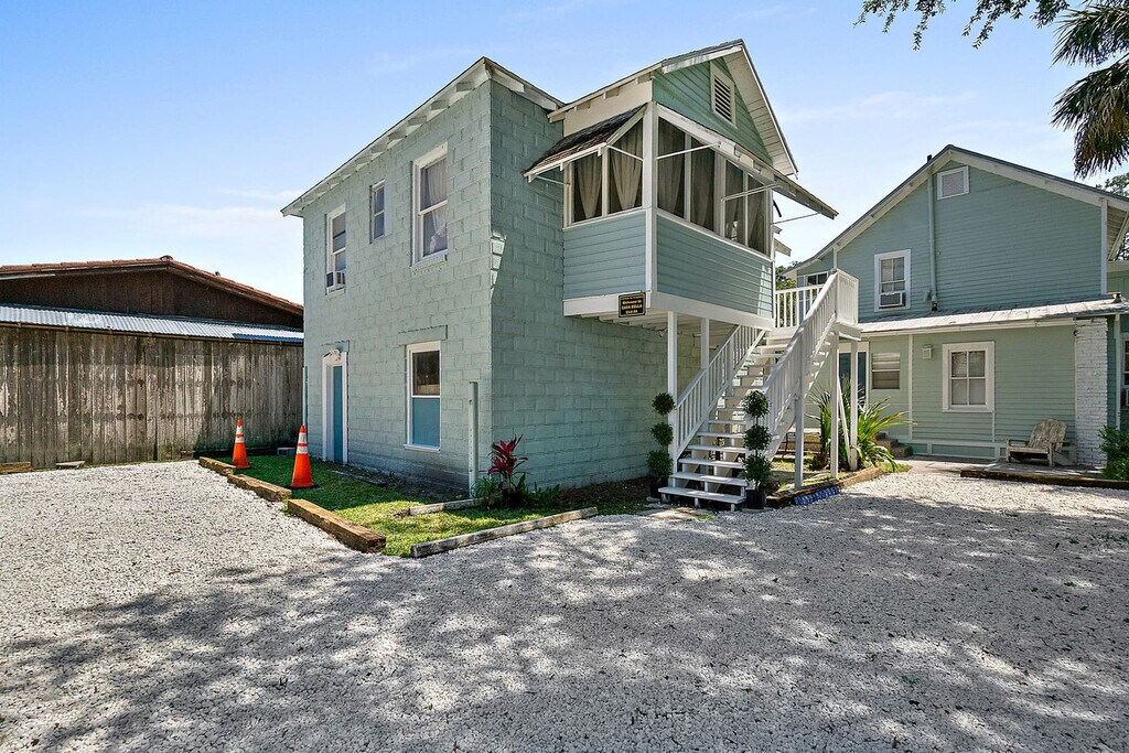 Feel at home in this charming apartment with retro vibes situated in the Uptown neighborhood of St. Augustine. Just a short walk to many top attractions, bars, and restaurants, you can park your car and explore the Oldest City on foot. This apartment is located above a garage behind a multi-family home. Swoon over this chic apartment, recently renovated with modern updates while maintaining its historical charm. After walking up the stairs, you'll be greeted by the first of two balconies perfect for relaxation. The spacious living room invites you to a homey stay, complete with a smart TV ready to stream your favorite Netflix shows. The galley kitchen is fully equipped with utensils, cookware, plates, and glasses for quick meals, and features retro-style appliances including a microwave, Keurig, and toaster. Enjoy meals inside or on the balcony with an additional dining set. Rest easy in the two cozy bedrooms, each with a queen bed, and refresh in the full bathroom with a walk-in shower stocked with essentials and fluffy white towels. Off-street parking for two vehicles is provided at the back of the home. Located on Rohde Ave, this home is just a few minutes' walk to many shops, restaurants, and the downtown area. About a 5-10 minute walk to the Downtown Historic area and top attractions such as Ripleys and Castillo de San Marcos. A convenience store is nearby for stocking up on drinks and snacks, and amazing places to eat and drink are just a short walk away. Quiet hours begin at 10 pm and all noise must be minimized at this time. Window AC units are installed for heating and cooling, as there is no central AC. The minimum age to book is 21, and the primary guest must be present for the duration of the stay. No parties are allowed, and any guests outside of the reservation must vacate the property during quiet hours. A security camera is installed at the front door, and tampering with it may result in reservation cancellation. No pets are allowed, and no smoking or vaping is permitted on the property. Late check-outs and early check-ins require prior approval, and guests who stay past checkout time will be charged an additional fee of $50 per hour. Illegal drugs and underage drinking are strictly prohibited. The home is not child-proofed, so parents with young children use it at their own risk. [SI]