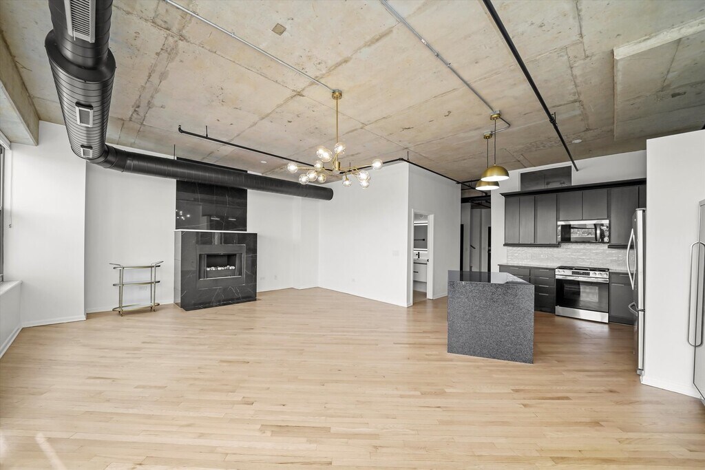 Chic West Loop loft corner unit featuring a bright, open-concept floor plan, high ceilings, and expansive windows. Hardwood floors guide you through the spacious unit, anchored by a cozy fireplace and accented by character-adding exposed ductwork. The kitchen invites stainless steel appliances and a breakfast island, while the master suite offers dual closets and a luxurious bath with a garden tub and double sinks. Enjoy the ease of in-unit laundry, your own private balcony, and a premium location near parks, medical district, Madison row, and Fulton Market Restaurant row. Skinner West school district, Whitney Young HS. listing courtesy of: RE/MAX Premier