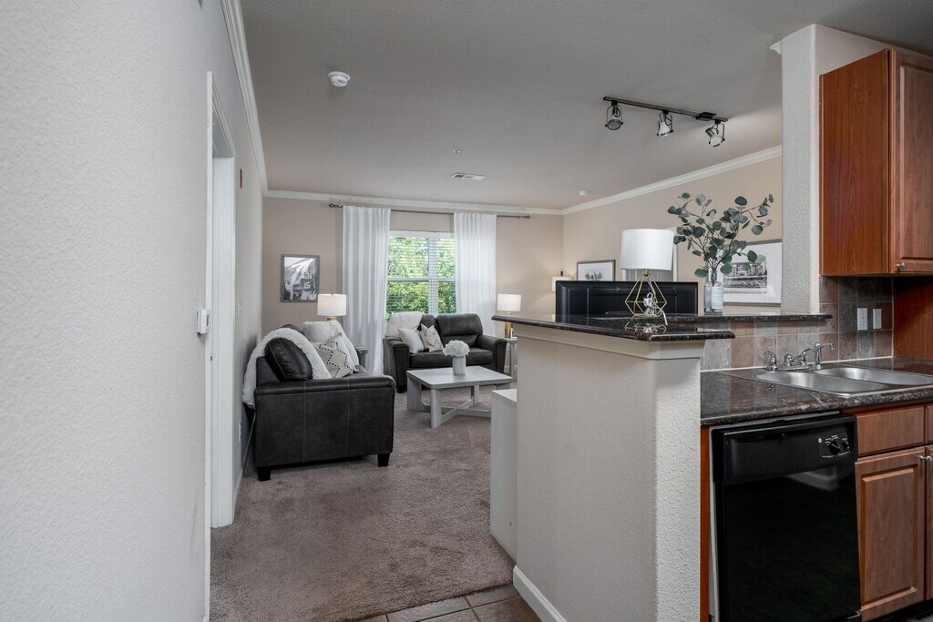This 2 bed/ 2 bath condo in a gated community is within walking distance of campus, and offers luxurious living. Features 9' ceilings with crown molding, granite counters and cherry cabinets in kitchen and baths, walk-in closet and private bath for every bedroom, refrigerator, stove, microwave, washer & dryer, and pantry, French doors leading to private patios, plus high-speed internet, cable TV, telephone and computer modem connections. Complex features lagoon-style pool, fitness center, clubhouse with indoor/outdoor kitchen that opens to the pool area, well-lighted grounds, controlled entry, surveillance cameras in community areas, privacy viewer in front door, 24/7 monitored fire safety system.