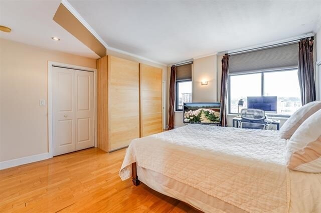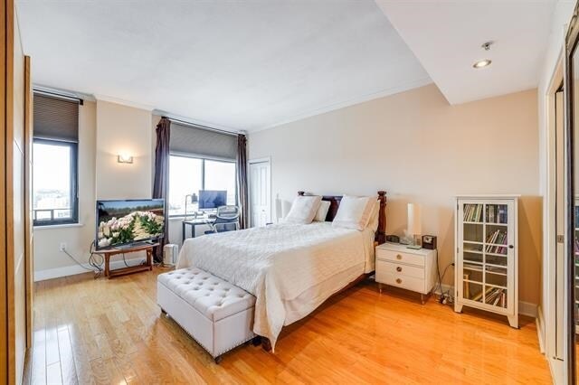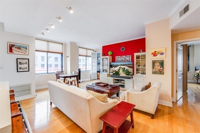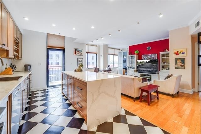 MICHAEL KLEINModern and beautifully renovated spacious 2 bedroom/ 2 bathroom home in downtown's Hoboken Grande. Open concept floor plan features a completely redone and fully equipped chef's kitchen with top of the line stainless steel appliances, modern and ample cabinetry, marble countertops and an expansive cascading breakfast island overlooking the living/ dining space and private terrace. Expansive master suite easily fits a king sized bed, walk-in closet, and a renovated ensuite. Home also features hardwood floors throughout, central HVAC, recessed lighting, washer/ dryer, private terrace, and plenty of closet space throughout. Hoboken Grande is an elevator building with part-time doorman, shuttle to PATH, common patio deck, and fitness center with a sauna room. Conveniently located just a few minutes to Holland Tunnel and all major highways. 2 Parking Spots included tandem Included. Available 12/1/25.