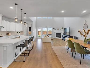Beautiful 3-bedroom, 3-bath home with 2-car garage featuring an open floor plan , soaring ceilings, large windows, and a gas log fireplace. The kitchen offers a spacious island, white shaker cabinets, quartz countertops, gas cooktop, and pantry. Primary suite includes dual sinks, oversized shower, and walk-in closet. Private office ideal for remote work.