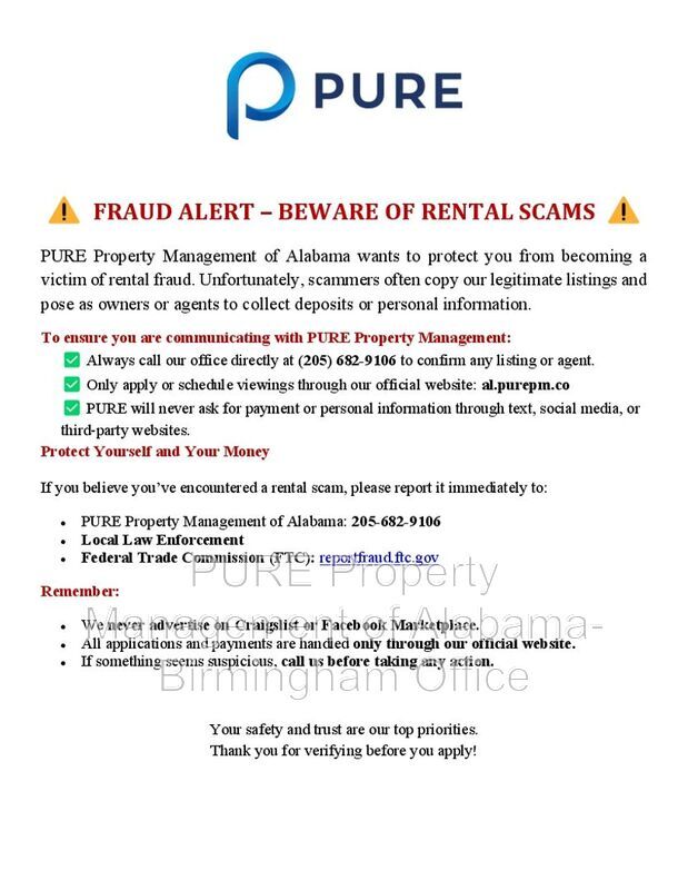 Welcome home to 6121 Court M in Birmingham! This 3 bedroom, 1 1/2 bath house features hard surface flooring throughout. It has recently been updated with fresh paint. The home has a large yard. You can apply today by visiting us at Make sure you are communicating directly with PURE - If you are texting someone via Facebook or Craigslist, that is NOT a PURE associate. We do not advertise on FB or CL. SECURITY DEPOSIT INFORMATION Pay the traditional security deposit amount, or reduce your move-in costs with our Security Deposit Waiver Program. Eligible applicants can replace the traditional deposit with an affordable monthly fee. While you remain responsible for any damages, this program offers substantial upfront savings! PETS ACCEPTED: (Insert # of pets accepted and type) To simplify pet verification and ensure policy clarity, we use PetScreening, a third-party service. All applicants with pets must complete this screening. Full animal policy details are available on our website. Breed restrictions apply. Pet Fees: $400 Non-refundable for the first pet, $250 for each additional pet. Monthly Pet fee ranges from $30-$80 per pet, per month. *Inapplicable to assistance animals. RESIDENT BENEFIT PROGRAM Elevate your living experience! Every PURE home includes our Resident Benefits Package, ranging from $25.99 - $49.99, and may include perks such as on-demand pest control, liability insurance, credit building, and much more! AMENITIES AND SERVICES INCLUDED Moving in just got easier! Enjoy PURE Utility Concierge services at no extra cost, making your transition smooth and simple. This property is wired for lightning-fast Gig-Speed Internet for just $65/month! The lessee(s) understand(s) that the move-in fee is a one-time fee of $ 250.00. Application Fee: $75.00 per applicant. AREC 000149253-0