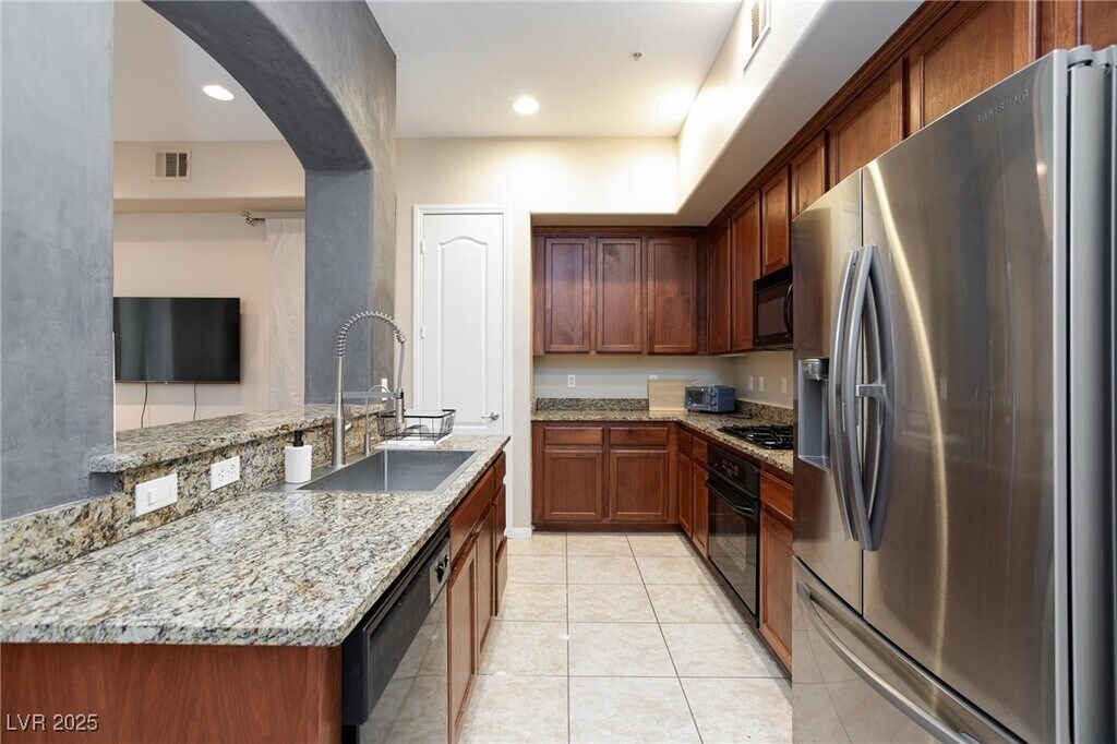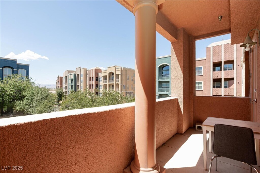 HIGHRISE LIVING ON THE STRIP!!Highly desirable community located on the south end of the Strip. Upgraded 3 bed, 2 bath, 1st floor condo located in Guard gated community. Open concept floorplan with separate living & dining areas. Nicely upgraded kitchen w/breakfast bar, granite counters, plenty of storage space & black appliance, dark wood cabinets. Separate laundry room. Tile & wood laminate flooring thru-out living areas. Nice size primary bedroom with dbl sinks & separate tub/shower. Balcony access from primary & 2nd bedroom. All beds with walk-in closets. Park-like atmosphere. Elevator. Awesome amenities. One small pet. (Base Rent $1895 + $37 RBP)