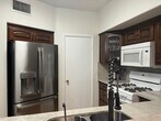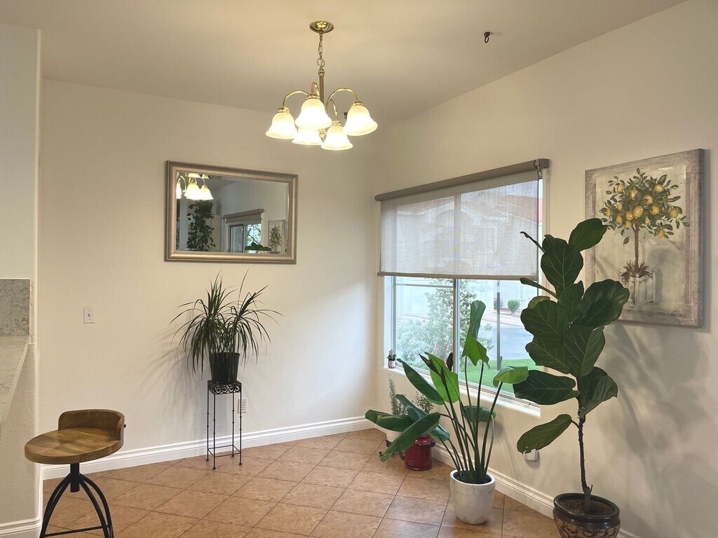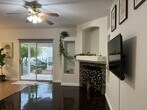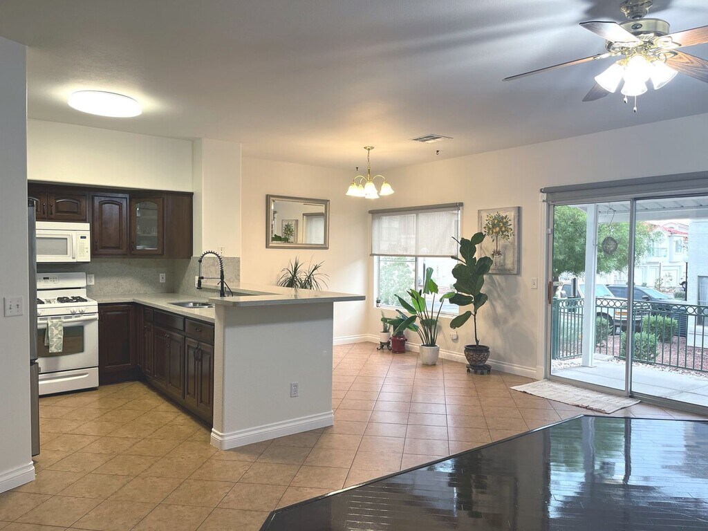 Denise GublerRemodeled, first floor 1428 sq ft, 2 bed+ den, 2 bath, 1 car detached garage condo in gated community. AC & water heater were replaced in 2020 & house is newly painted. Kitchen w/breakfast bar w/granite counters, full granite backsplash, raised custom cabinets w/soft close doors & drawers, ceramic tile floors, new SS refrigerator, white stove & microwave, walk in pantry & dining nook. Living room w/ceiling fan & light, wood laminate floors & brick niche w/slider to outdoor covered patio. Primary bed w/ceiling fan & light, wood laminate floors & walk in closet. Primary bath w/dual sinks, granite countertops, travertine tile backsplash, linen closet & tub/shower combo w/travertine tile surround. Bed 2 w/ceiling fan & light, wood laminate floors & closet. Bath 2 w/tile floors, granite counters & tub/shower combo w/travertine tile surround. Den w/ceiling fan & light & wood laminate floors. Covered patio w/concrete slab and wrought iron railing. Detached 1 car garage w/walkway to front door