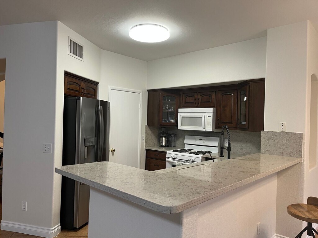 Remodeled, first floor 1428 sq ft, 2 bed+ den, 2 bath, 1 car detached garage condo in gated community. AC & water heater were replaced in 2020 & house is newly painted. Kitchen w/breakfast bar w/granite counters, full granite backsplash, raised custom cabinets w/soft close doors & drawers, ceramic tile floors, new SS refrigerator, white stove & microwave, walk in pantry & dining nook. Living room w/ceiling fan & light, wood laminate floors & brick niche w/slider to outdoor covered patio. Primary bed w/ceiling fan & light, wood laminate floors & walk in closet. Primary bath w/dual sinks, granite countertops, travertine tile backsplash, linen closet & tub/shower combo w/travertine tile surround. Bed 2 w/ceiling fan & light, wood laminate floors & closet. Bath 2 w/tile floors, granite counters & tub/shower combo w/travertine tile surround. Den w/ceiling fan & light & wood laminate floors. Covered patio w/concrete slab and wrought iron railing. Detached 1 car garage w/walkway to front door.