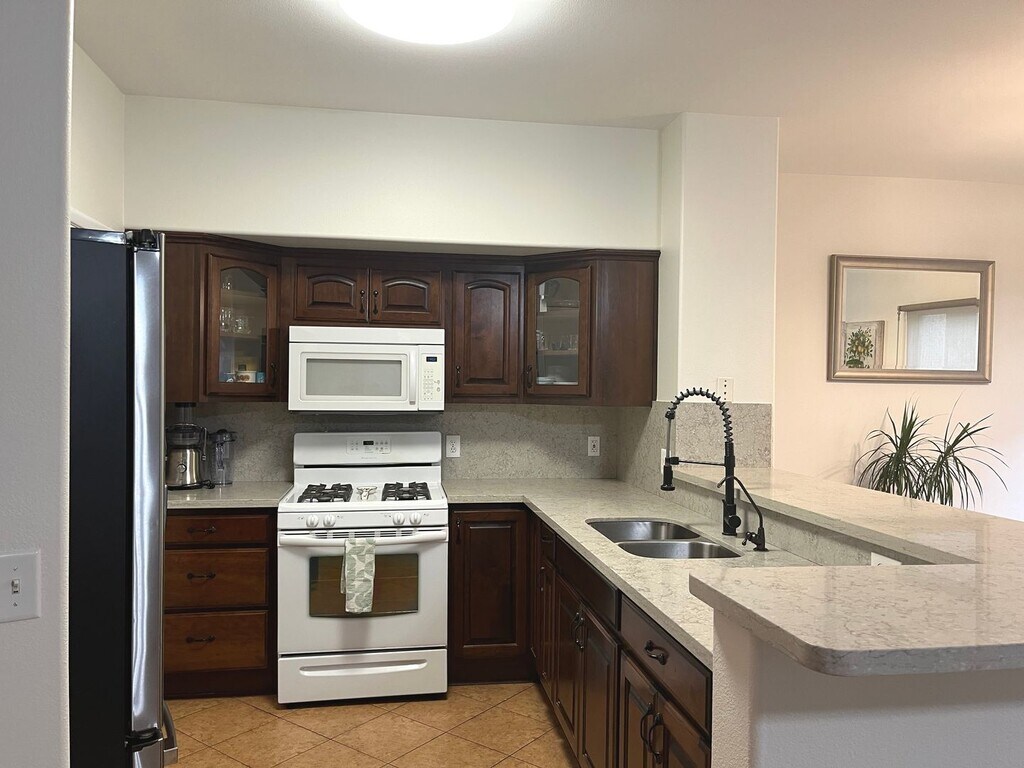 Remodeled, first floor 1428 sq ft, 2 bed+ den, 2 bath, 1 car detached garage condo in gated community. AC & water heater were replaced in 2020 & house is newly painted. Kitchen w/breakfast bar w/granite counters, full granite backsplash, raised custom cabinets w/soft close doors & drawers, ceramic tile floors, new SS refrigerator, white stove & microwave, walk in pantry & dining nook. Living room w/ceiling fan & light, wood laminate floors & brick niche w/slider to outdoor covered patio. Primary bed w/ceiling fan & light, wood laminate floors & walk in closet. Primary bath w/dual sinks, granite countertops, travertine tile backsplash, linen closet & tub/shower combo w/travertine tile surround. Bed 2 w/ceiling fan & light, wood laminate floors & closet. Bath 2 w/tile floors, granite counters & tub/shower combo w/travertine tile surround. Den w/ceiling fan & light & wood laminate floors. Covered patio w/concrete slab and wrought iron railing. Detached 1 car garage w/walkway to front door