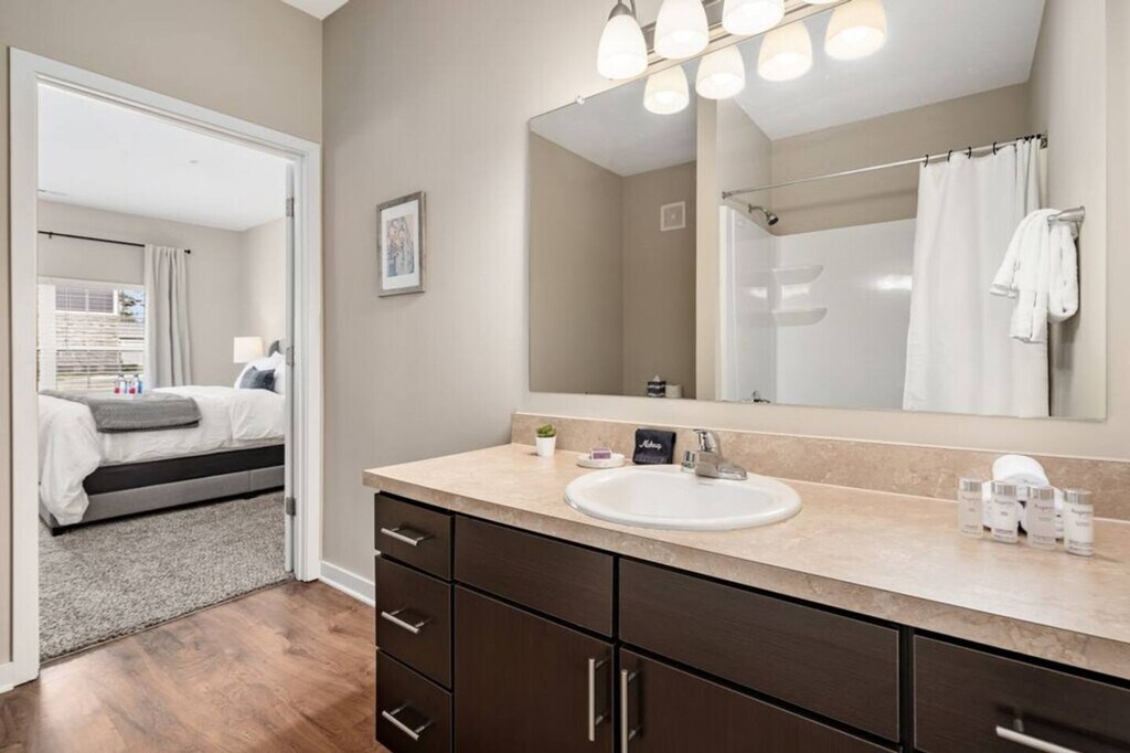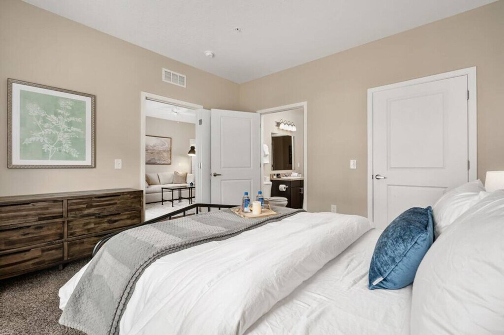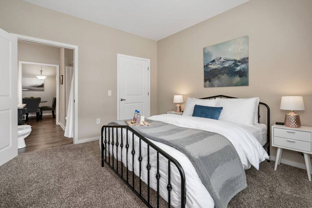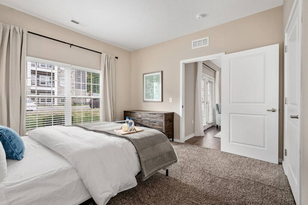 Welcome to The Albany Perch, a beautifully furnished apartment located on the quiet 3rd/top floor in the New Albany area, near Intel and Google/Meta data centers. Enjoy easy free parking, a pet-friendly environment, and a king master suite with an en-suite bath. The second bedroom features a queen bed, both with new mattresses and Frette bedding. The apartment includes a washer and dryer, a balcony with seating, fast Wi-Fi, and a 50" smart TV with DirecTV. You'll also have access to a gym and pool. This apartment is designed for long-term stays, featuring dressers, large closets, comfortable furniture, and a fully loaded kitchen with all appliances and kitchenware. Enjoy the luxury of two large bedrooms, each with a Winkbeds luxury mattress, white linens, and goose down comforters from Frette. The space is beautifully decorated with modern chic furnishings and offers a bright ambiance. Self-check-in is easy via a secure door keypad. Pets under 75 lbs are welcome, with a maximum of 2 pets allowed. No commonly restricted pets or breeds, please. Enjoy peace of mind knowing the apartment is obsessively cleaned, whether pets join you or not. Located within a beautiful modern community in the Westerville/New Albany area, this apartment offers a quiet and peaceful environment perfect for commuting anywhere in Columbus. It's just around the corner from the new Target, a 5-minute drive from numerous restaurants on North Hamilton Road, and 10-15 minutes from Easton Town Center, one of the city's hottest dining and shopping areas. As a guest, you'll enjoy complimentary amenities at the clubhouse, including a fully equipped fitness center, a coffee machine, and an outdoor pool. This apartment is located on the 3rd/top floor, offering peace and quiet with no apartments above. However, there's no elevator, so be prepared to climb a few steps. The community is 100% smoke-free, prohibiting smoking anywhere, including the balcony, breezeways, and parking lots. Flexible stays are available, with a minimum of 30 nights and the option to extend with 2 weeks' notice. A partial refund is provided for unused nights beyond the 2-week mark. ID verification is required before arrival, with a quick and easy process. [SI]