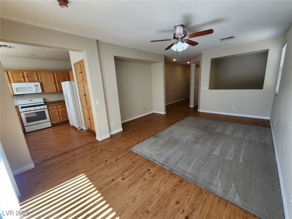 WHAT A GEM! Welcome to your quaint, single story, Southern Highlands home. Located within a gated community, this 2 bed/2 baths home, plus den/formal dining room, opens to the living room, bright and airy from the southern light exposure. Ceiling fans in every room for your comfort, custom engineered wood flooring throughout with beautiful attention to detail, all appliances, a covered back patio, and all appliances included elevate this home space. Total Periodic Rent includes: $90 yard maintenance, $25 trash, and $25 sewer monthly fees.