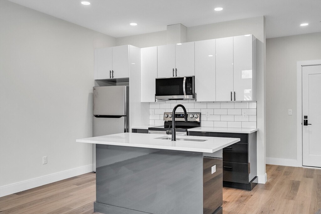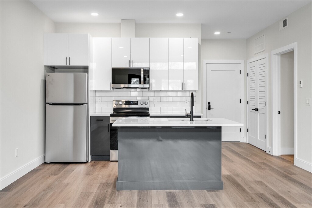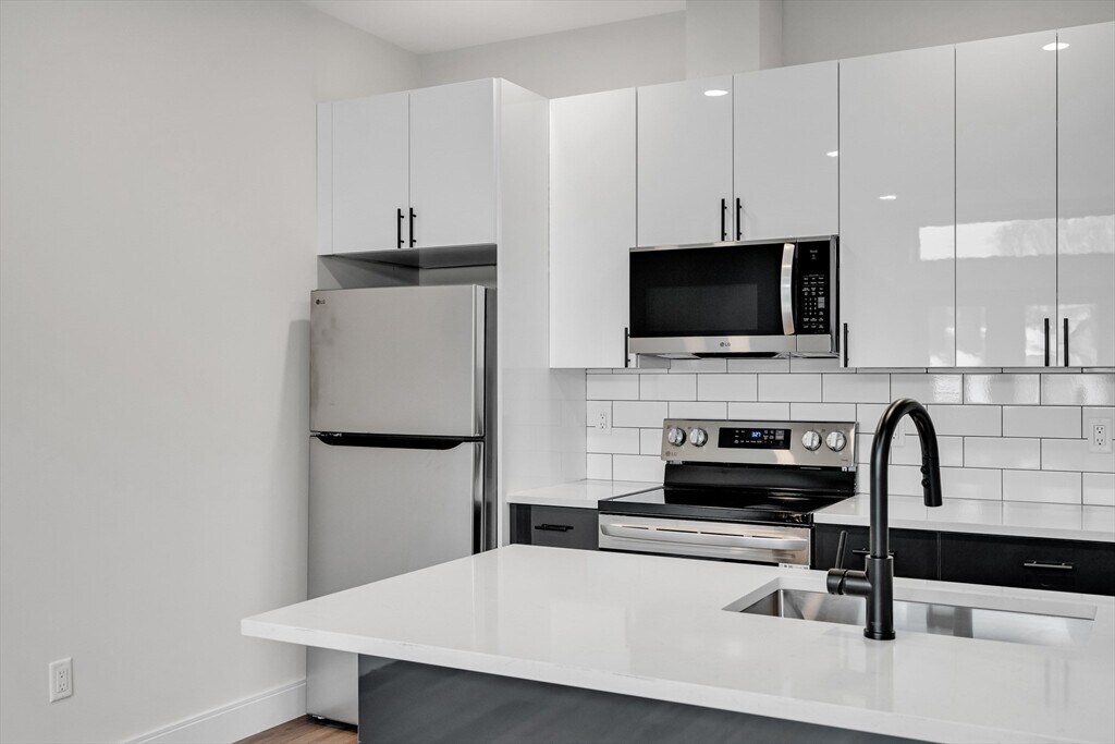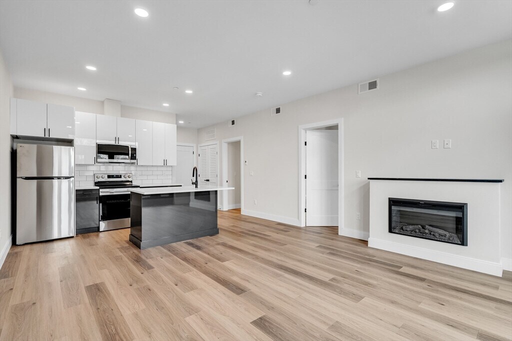Located next to Roslindale Village Train Station. 63 Belgrade is a brand-new elevator building with garage parking. This unit is a 1 bed plus den/office and 2 bathrooms. Unit features an outdoor deck/ patio and 2 full baths. Modern finishes with open concept layout. Kitchens feature European style cabinetry,quartz counters and stainless steel appliances. Designer tiled baths w/ glass shower enclosures. In unit laundry,large closets,Central Air and hybrid hot water heater. Pets ok with restrictions. Lots of street parking available.Photos/videos may be of a similar unit.Underground parking available for an additional $200 MLS# 73488967