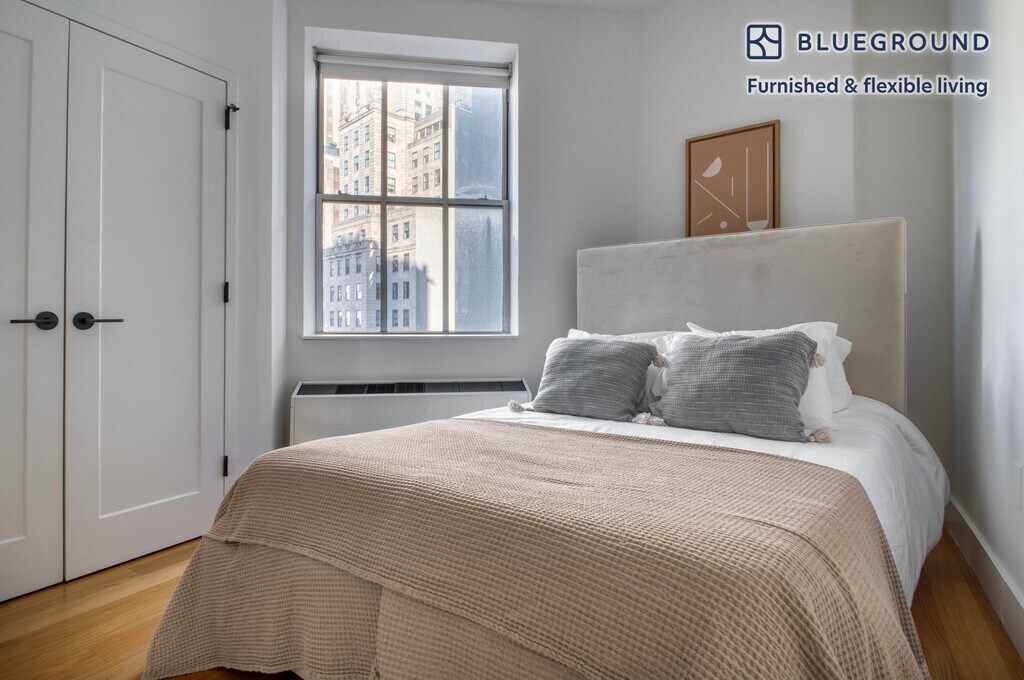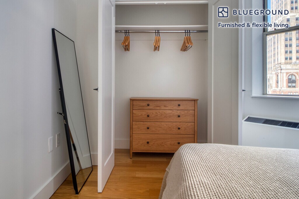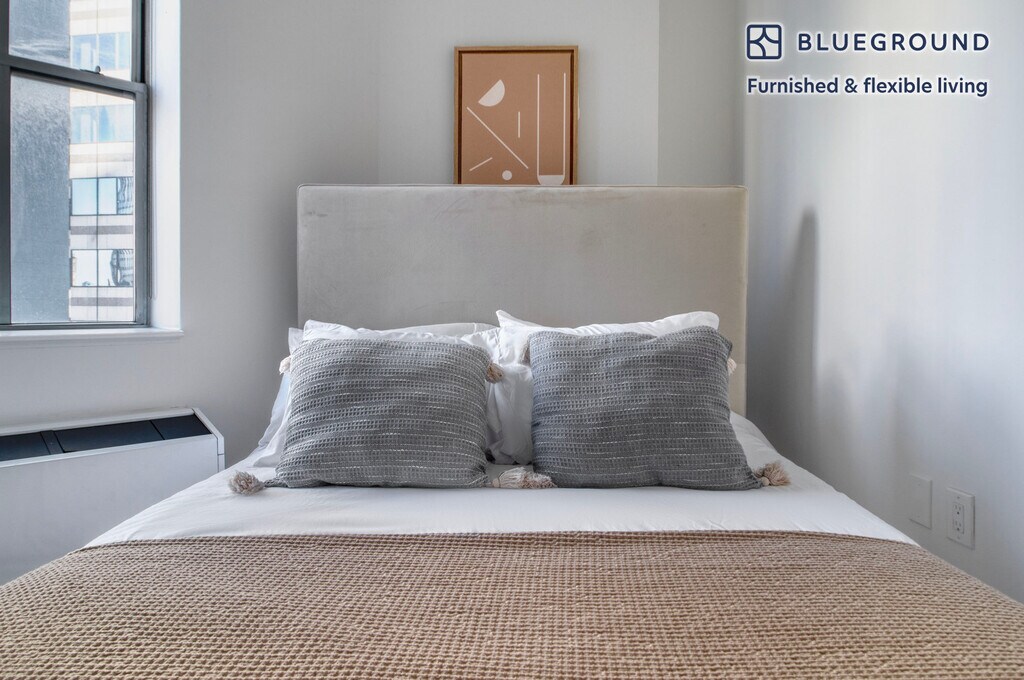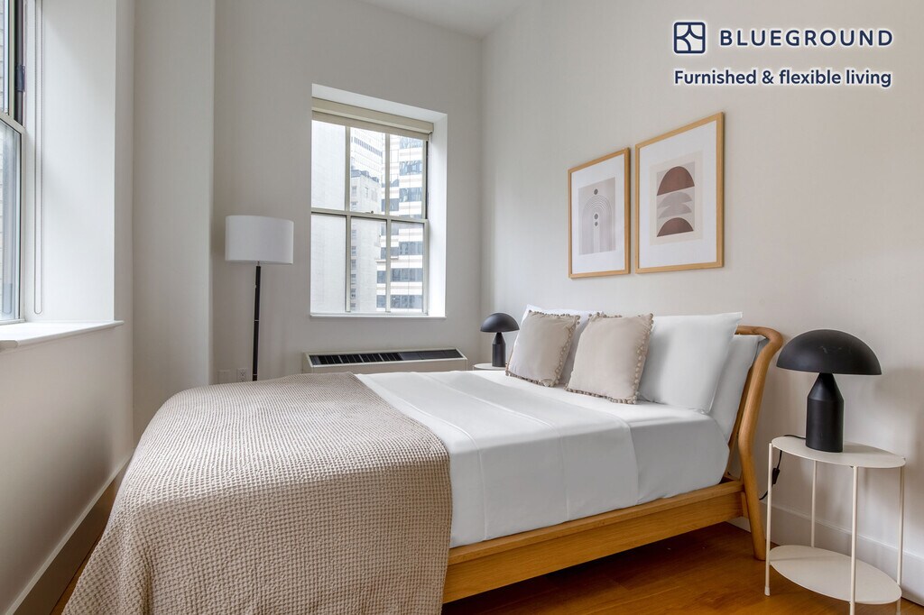 Show up and start living from day one in New York with this beautiful one bedroom Blueground apartment. You’ll love coming home to this thoughtfully furnished, beautifully designed, and fully equipped Financial District home with stunning high floor views over the city. (ID #NYC1339) The advertised rate of $5,380/month is the lowest available price, based on a 11 month(s) and 29 day(s) stay with a move-in date of April 26, 2026. Rates vary depending on the duration of stay, season, and other parameters. For exact pricing and additional pricing components, please visit our website and enter your desired move-in and move-out dates. The rate is applicable when billed upfront; it can be higher if billed in multiple payments. Brokers are welcome to reach out. Were you looking for an unfurnished lease? Try Blueground instead and upgrade from unfurnished to furnished living: - Furnished at rates comparable to unfurnished - No setup or furniture costs - save thousands - Move-in ready - save time, just bring your suitcase Designed with you in mind Thoughtfully designed with bespoke finishes, modern furnishings, and a fully equipped kitchen, you’ll enjoy that “I’m home” feeling with this Blueground apartment. Whether you’re lounging in your sophisticated living room streaming the latest and greatest entertainment on the smart TV or premium wireless speaker, or getting some well-earned rest on the superior quality mattress with fully stocked linens, you’ll fall in love with everything this Financial District apartment has to offer. Sleeping arrangements Queen Bed, 63in/160cm Amenities Building amenities unique to this one bedroom apartment include an on-site: - Doorman - Dryer in building - Elevator - Game room - Washing machine in building - Lounge - Library - Media room - Pets allowed - Playroom - Rooftop BBQ Arrival and ongoing support The entire apartment is yours to enjoy! Throughout your stay, you’ll have access to our Client Experience team through the Blueground App. You can schedule additional cleanings, submit maintenance requests, and view our neighborhood recommendations with just a few taps. We’ll share all details upon confirmation of your stay. Ideally Located This furnished apartment is located in the Financial District, also known as FiDi. Home to Wall Street, One World Trade Center, the South Street Seaport, and Bowling Green it is a constant hub of activity. During the week the sidewalk is always bustling and the restaurants are filled with professionals. The glittering skyscrapers and well-known landmarks make this one of the city’s most recognizable and historic neighborhoods. By subway, Times Square is about 20 minutes away. Other things to note Building amenities may have an extra cost. This Blueground apartment has flexible lease options, allowing you to book it for one month, a year, or more. Pets are welcome, though weight limits and breed restrictions apply and may incur fees. Brokes CYOF. We take great pride in ensuring every photo displayed is shot in our own units with our actual furnishings. That said, we regularly refresh our decor and furniture arrangement, which may differ from what’s pictured. [SI]
