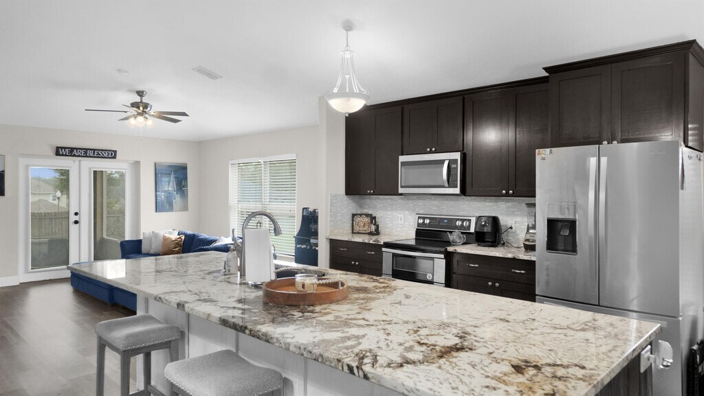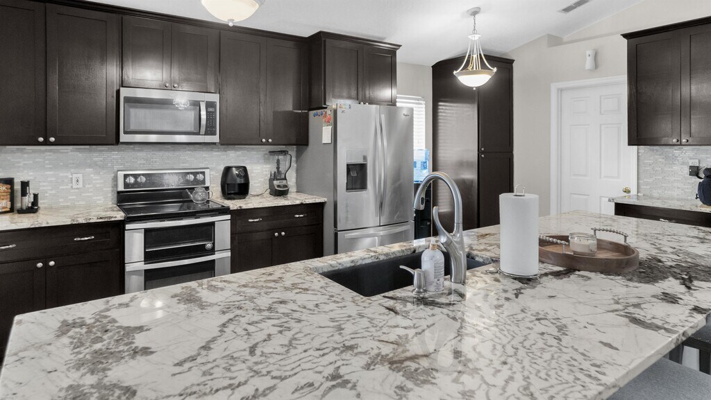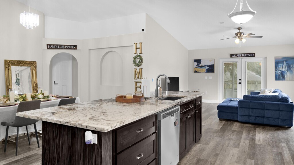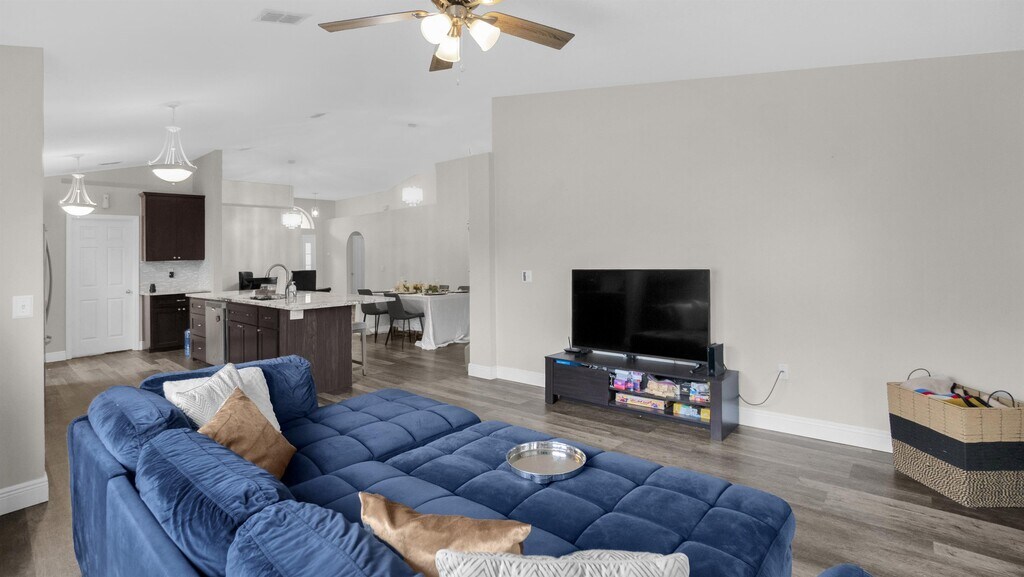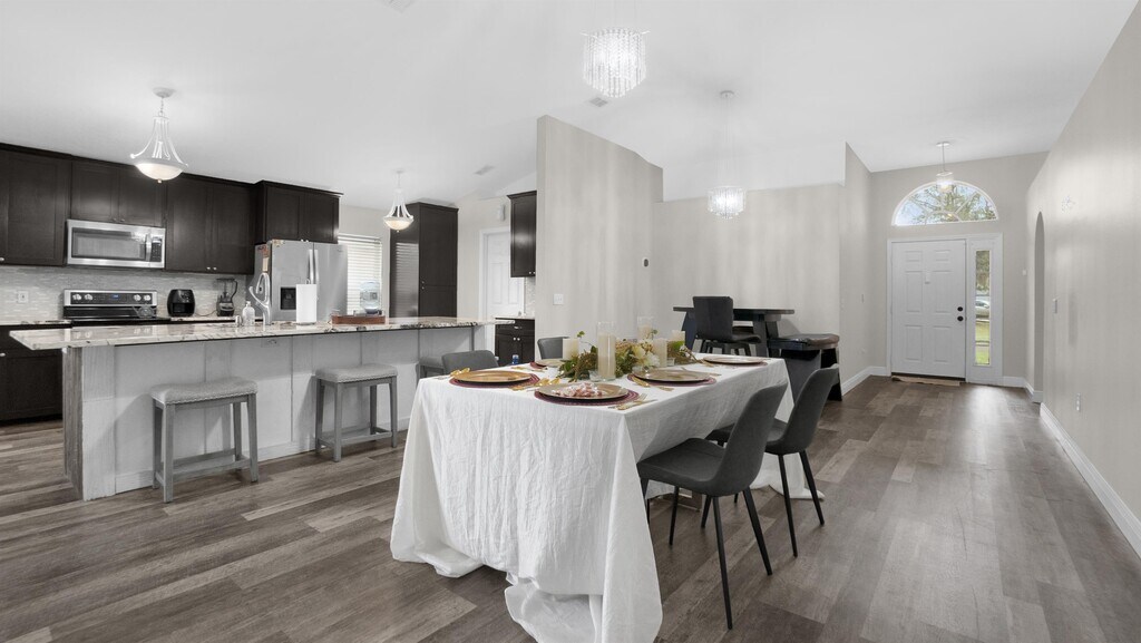 This beautiful Apopka home is a MUST SEE - tucked away in the established Lake Doe Cove community with a bright OPEN CONCEPT FLOOR PLAN, RENOVATED KITCHEN, HIGH CEILINGS and gorgeous VINYL PLANK WOOD FLOORS in all the main living areas! This home flows from the moment you walk in the front door and the wide open floor plan is highlighted by the generous LIVING and DINING areas that lead straight to the heart of this home, the stunning updated kitchen! The family chef will fall in love and look forward to preparing meals in this lovely space boasting plenty of CABINETS that go all the way up to the ceiling, STAINLESS STEEL APPLIANCES, GRANITE COUNTERS, a CUSTOM BACKSPLASH, ample storage and a massive ISLAND for even more storage and prep space and BREAKFAST BAR seating, perfect for entertaining! Ideal SPLIT BEDROOMS delivers a large PRIMARY SUITE showcasing a VAULTED CEILING, decorative ceiling fan, WALK IN CLOSET and a private EN-SUITE BATH with a large vanity, SOAKING GARDEN TUB and direct access to the backyard! Three additional bedrooms all with ceilings fans, great sized closets and high ceilings, plus an UPDATED SECOND FULL BATH complete with a CUSTOM TILED WALK IN SHOWER only add to the appeal of this must see home! FRENCH DOORS off the living area provide access to an expansive SCREENED IN PORCH perfect for creating a relaxing outdoor space, sip a cup of coffee in the morning or spend the weekend with a good book - all overlooking a spacious FULLY FENCED backyard with spectacular MATURE TREES for plenty of shade! You are conveniently located near Lake Apopka, parks, shopping, dining and can enjoy easy access to SR 429, the Florida Turnpike, SR 414, SR 451, and the Maitland Expressway to Downtown Orlando! Only minutes to the Wekiwa Springs State Park offering 7,000 acres of outdoor recreation, nature trails, and natural spring fed waters leading to the Wekiva River! With room to relax inside and out, this home is the perfect place to call home! This beautiful Apopka home is a MUST SEE - tucked away in the established Lake Doe Cove community with a bright OPEN CONCEPT FLOOR PLAN, RENOVATED KITCHEN, HIGH CEILINGS and gorgeous VINYL PLANK WOOD FLOORS in all the main living areas! This home flows from the moment you walk in the front door and the wide open floor plan is highlighted by the generous LIVING and DINING areas that lead straight to the heart of this home, the stunning updated kitchen! The family chef will fall in love and look forward to preparing meals in this lovely space boasting plenty of CABINETS that go all the way up to the ceiling, STAINLESS STEEL APPLIANCES, GRANITE COUNTERS, a CUSTOM BACKSPLASH, ample storage and a massive ISLAND for even more storage and prep space and BREAKFAST BAR seating, perfect for entertaining! Ideal SPLIT BEDROOMS delivers a large PRIMARY SUITE showcasing a VAULTED CEILING, decorative ceiling fan, WALK IN CLOSET and a private EN-SUITE BATH with a large vanity, SOAKING GARDEN TUB and direct access to the backyard! Three additional bedrooms all with ceilings fans, great sized closets and high ceilings, plus an UPDATED SECOND FULL BATH complete with a CUSTOM TILED WALK IN SHOWER only add to the appeal of this must see home! FRENCH DOORS off the living area provide access to an expansive SCREENED IN PORCH perfect for creating a relaxing outdoor space, sip a cup of coffee in the morning or spend the weekend with a good book - all overlooking a spacious FULLY FENCED backyard with spectacular MATURE TREES for plenty of shade! You are conveniently located near Lake Apopka, parks, shopping, dining and can enjoy easy access to SR 429, the Florida Turnpike, SR 414, SR 451, and the Maitland Expressway to Downtown Orlando! Only minutes to the Wekiwa Springs State Park offering 7,000 acres of outdoor recreation, nature trails, and natural spring fed waters leading to the Wekiva River! With room to relax inside and out, this home is the perfect place to call home!