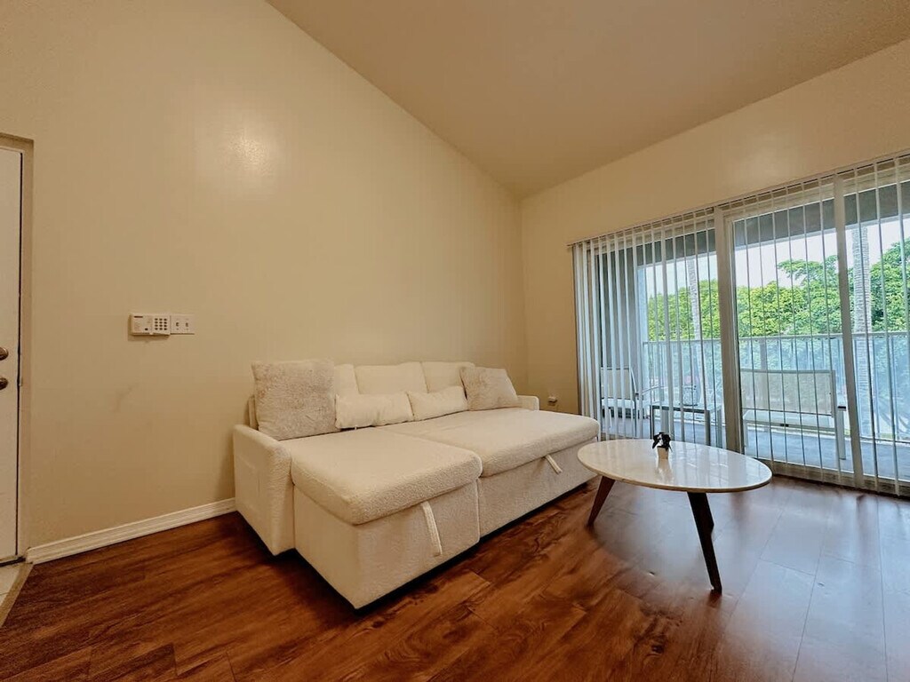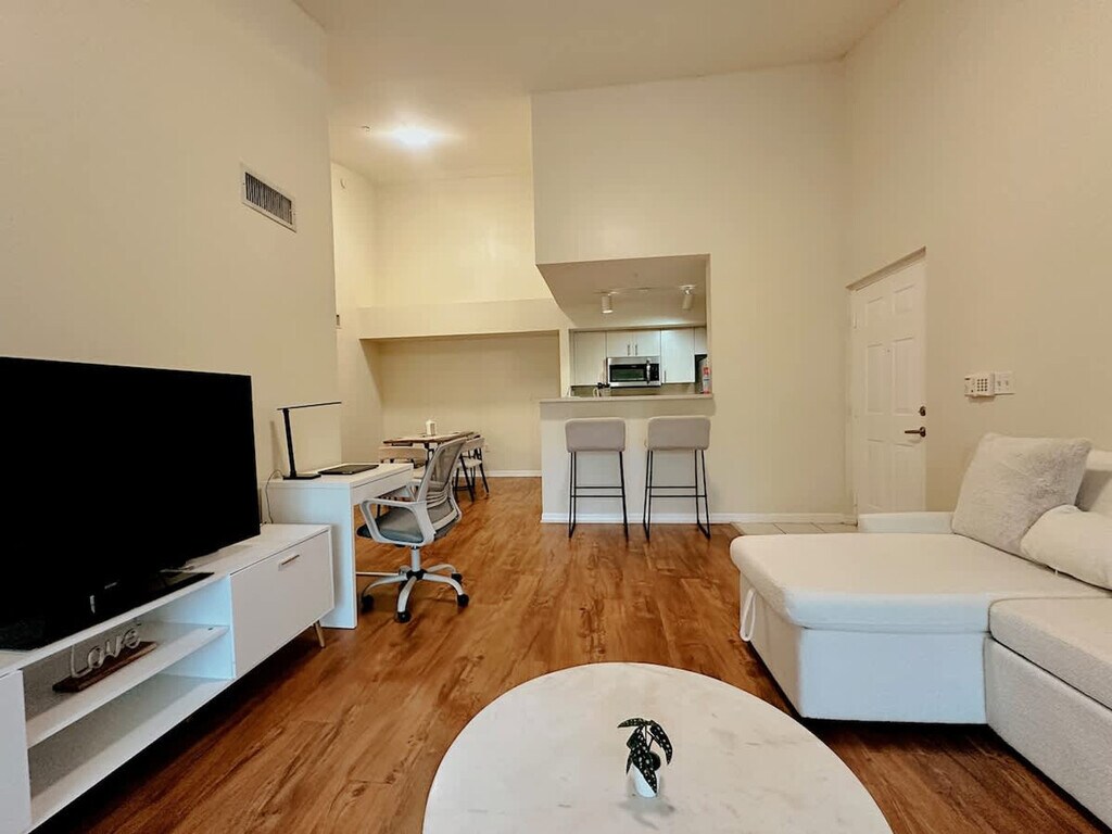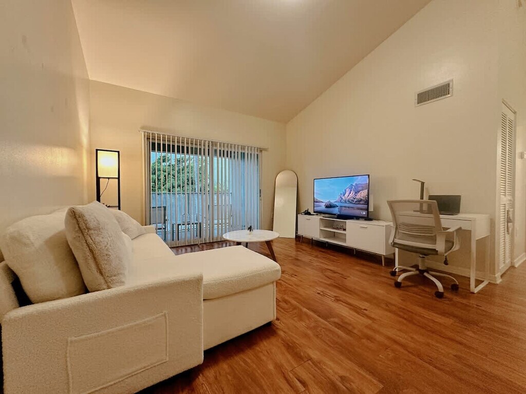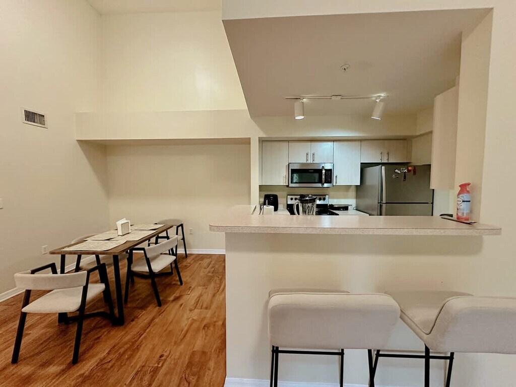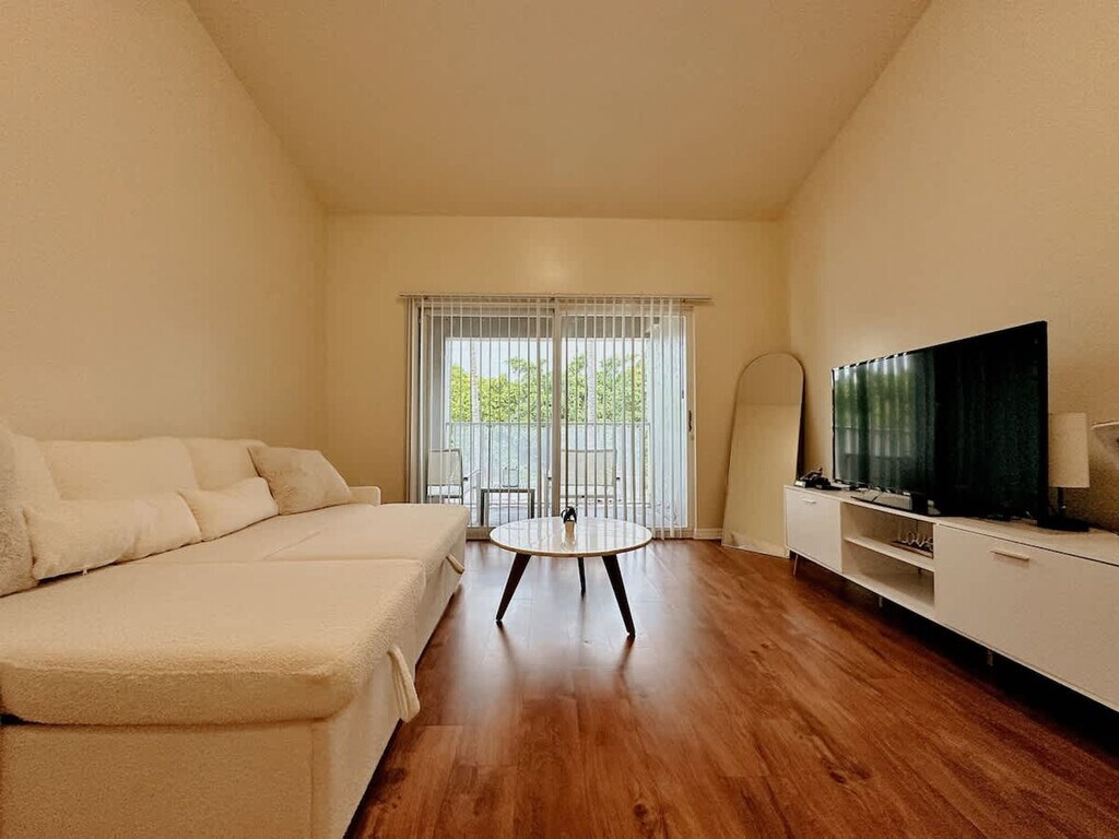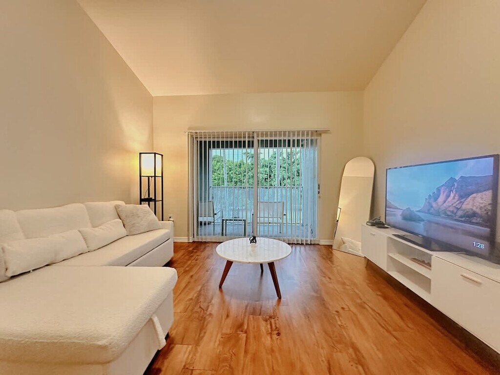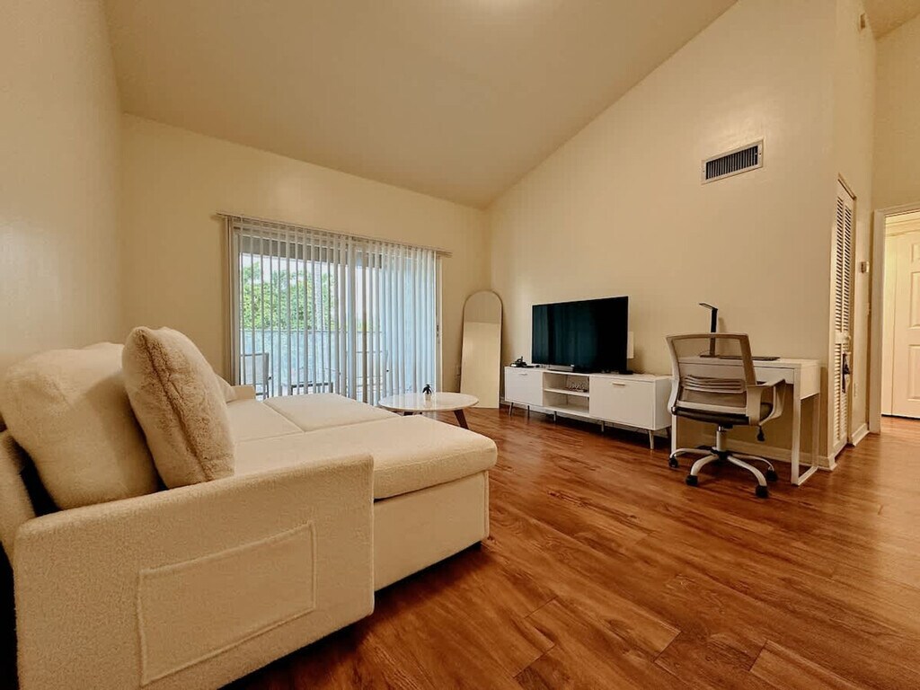 Feel at home in this charming apartment located in Pembroke Pines. Perfect for families, small groups, or short- to mid-term travelers, this residence features 1 cozy bedroom, 1 full bathroom, a fresh balcony, and a fully equipped kitchen. Enjoy high-speed Wi-Fi, air conditioning, and a private laundry area, all designed for an exceptional stay. This spacious apartment combines comfort with a peaceful location. The living room includes a sofa bed, Smart TV, workspace, and full-length mirror. The kitchen is equipped with a large refrigerator, blender, air fryer, microwave, coffee maker, oven, dishwasher, utensils, wine glasses, cups, pots, and pans. The bedroom offers a queen bed, closet, dresser, Smart TV, sheets, and pillows. The bathroom is full and spacious, including towels, conditioner, shampoo, and body wash. The balcony features outdoor furniture for relaxation. The apartment includes one parking space. For pet owners, a maximum of 2 pets up to 10 kg or 20 lb each are allowed, with an additional pet fee of $25 for extra pets. Please ensure pets are not on furniture or beds and clean up waste properly. Located in the heart of Pembroke Pines, this area is known for its peaceful atmosphere, walkable surroundings, and excellent convenience. Just minutes from shopping centers, parks, and major highways, it offers the perfect balance between suburban calm and urban access. Residents enjoy proximity to Pembroke Lakes Mall, Miramar Pineland Park, and Memorial Hospital West, all within a 10-minute drive. The area also features well-rated schools, local restaurants, and easy access to I-75 and Florida’s Turnpike. Smoking is prohibited throughout the property, including the balcony. Quiet hours are observed from 10:00 PM to 8:00 AM to respect the residential area. Check-in is from 4:00 PM and check-out is by 11:00 AM, with exceptions requested in advance. A maximum of 3 people, including visitors, are allowed on the property. Guests are liable for any damage caused by themselves, children, or pets. Parties and events are not allowed. Pets must not be left alone inside the property and should not exhibit noise or aggressive behavior. The living room includes a workspace, providing a convenient set-up for remote work. High-speed Wi-Fi is available to support all your connectivity needs.